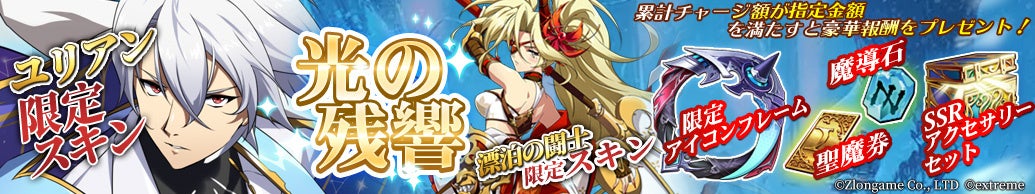 『光の残響』は累計チャージ額が指定金額に達すると、そのチャージ額に応じた報酬を獲得できる期間限定イベントです。限定アイコンフレームや聖魔券、魔導石、SSRアクセサリーセットなど、豪華報酬を獲得することができます。