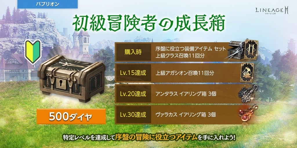 各武器種の高級武器を選択して手に入れることができる「初級冒険者の装備選択箱(刻印)」や「成長のポーション(10%)」などを獲得できるほか、10、15、20、25、30、40レベルを達成することに使用できる「初級冒険者の成長応援箱(刻印)」を獲得することができます。