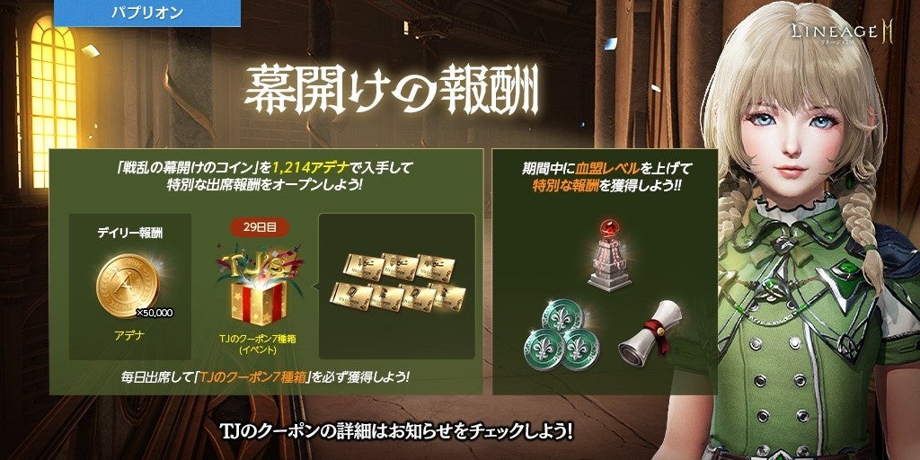 期間中、ショップの交換所にて1,214アデナと交換して獲得できる「戦乱の幕開けコイン(イベント)」を使用してオープンできる、「幕開けの報酬」が登場します。デイリー報酬として、50,000アデナのほか、「英雄級挑戦券選択箱(イベント)」や「希少級クラス/アガシオン獲得券(1回)(イベント)」などを獲得できます。最終日には7種類の「TJのクーポン」が入った、「TJのクーポン7種箱(イベント)」を獲得することが可能です。