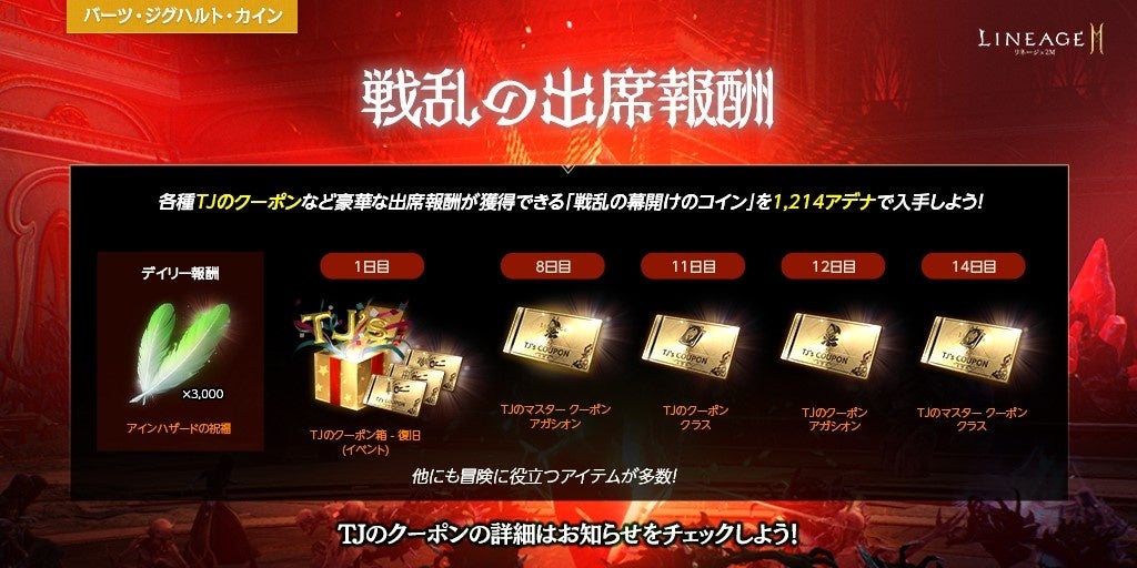 期間中、ショップの交換所にて1,214アデナと交換して獲得できる「戦乱のコイン(イベント)」を使用してオープンが可能な「戦乱の出席報酬」が登場します。デイリー報酬として、「アインハザードの祝福」3,000のほか、「TJのクーポン:装備復旧(武器/防具/アクセサリー)」を獲得できる「TJのクーポン箱 – 復旧(イベント)」や合成履歴の最大等級の合成に再チャレンジできる「TJのクーポン:クラス」「TJのクーポン:アガシオン」、合成の失敗回数によって獲得確率が上昇する「TJのマスター クーポン:クラス」「TJのマスター クーポン:アガシオン」などを獲得できます。