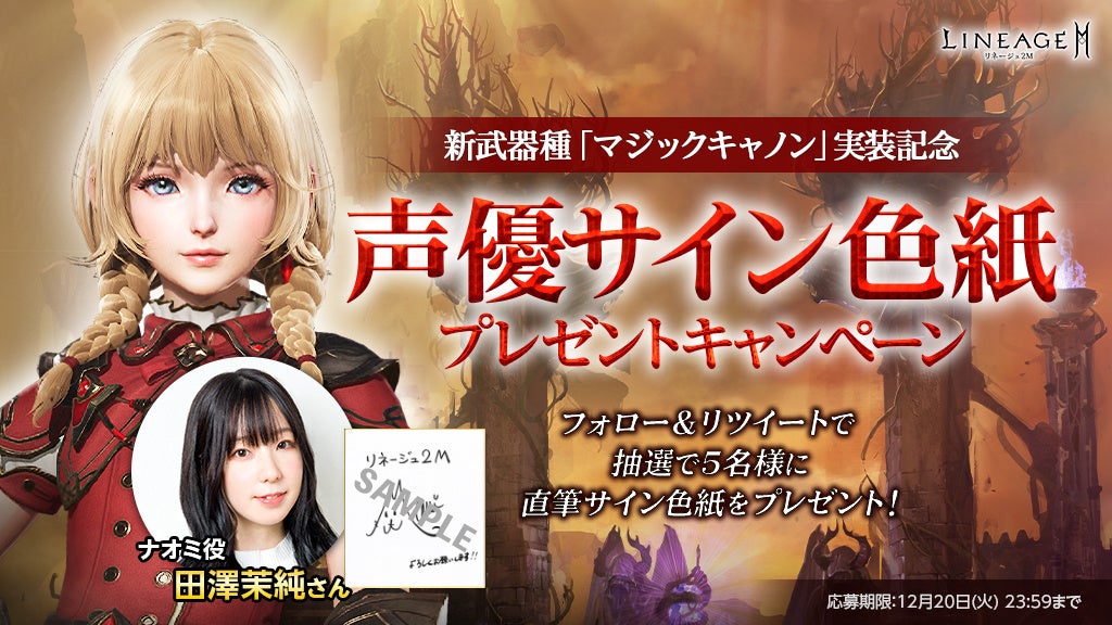 新武器種「マジックキャノン」の実装を記念して、ナオミ役 田澤茉純さんの直筆サイン色紙を抽選で5名様にプレゼントします。