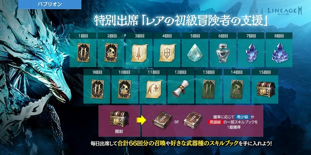 15日間の出席報酬として、「成長の啓示書(50万アデナ)」「成長の上級クラス/アガシオン獲得券(11回)(刻印)」や、「祝福された武器/防具強化スクロール(刻印)」、「祝福された生命の石(刻印)」などのアイテムを獲得することができます。