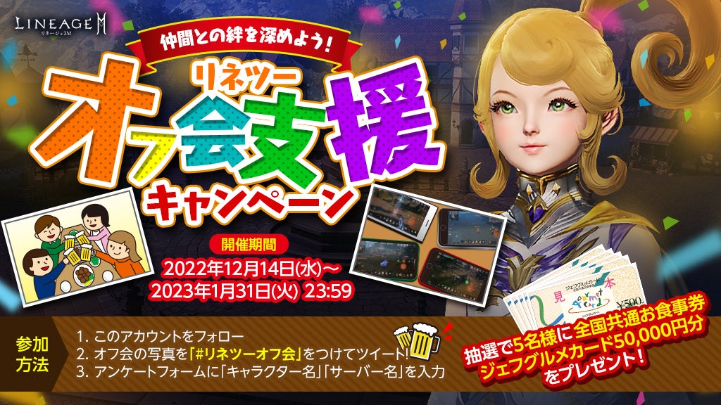 リネージュ2Mをプレイ中の皆様同士の交流を楽しんでいただくために、忘年会や新年会などのオフ会をサポートするキャンペーンを実施します。
