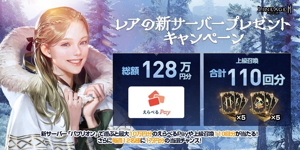 新サーバー「パプリオン」の「パプリオン01~04」のいずれかで遊び、キャラクターが特定のレベルに到達することで最大100,000円分のえらべるPayや、上級召喚110回分を抽選でプレゼントするほか、毎週抽選で12名様に10,000円分のえらべるPayをプレゼントします。