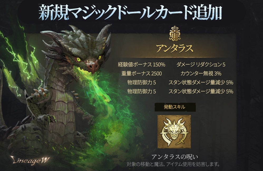 今回追加された新規マジックドール カードで、「[神話級マジックドール カード]アンタラス」が登場しました。そのほか「[伝説級マジックドール カード]白夜のデスナイト」のほか「[伝説級マジックドール カード]血の稲妻 ハーディン」が登場しました。