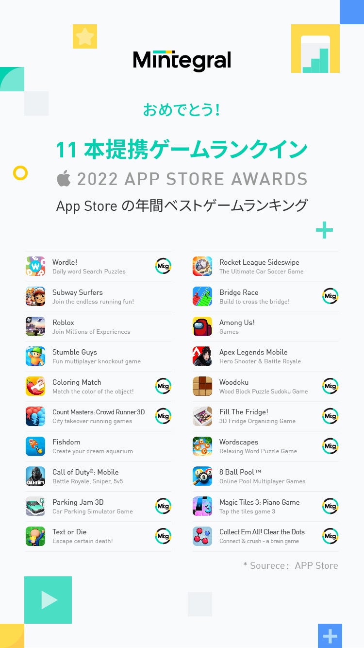 2022 App Store Awards のベスト無料ゲームのランキング中、Mintegralが提携している11タイトルはランクインできました!