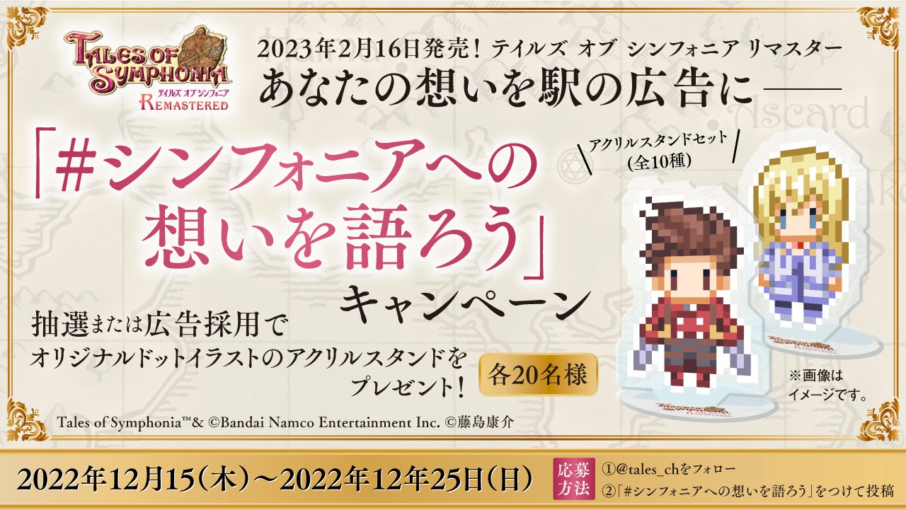 株式会社バンダイナムコエンターテインメントは、2023年2月16日(木)にNintendo Switch™/PlayStation®4/Xbox Oneにて発売予定の「テイルズ オブ シンフォニア リマスター」に関連して、3つの施策がスタートしたことをお知らせいたします。是非お楽しみくださいませ!