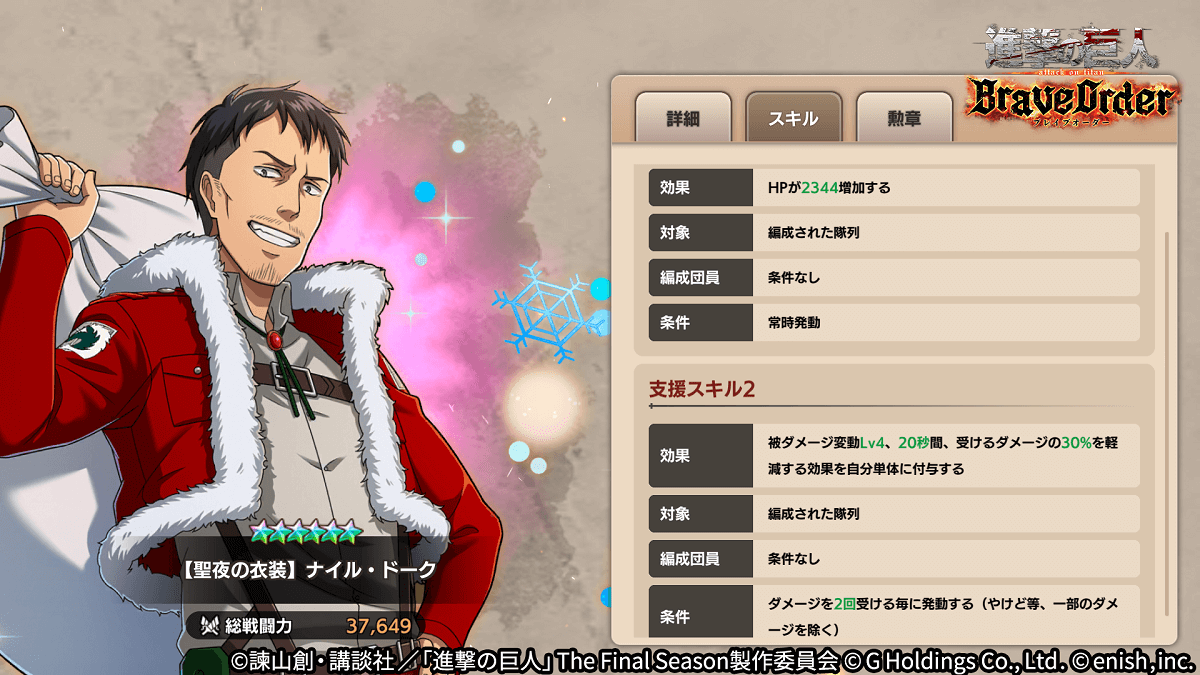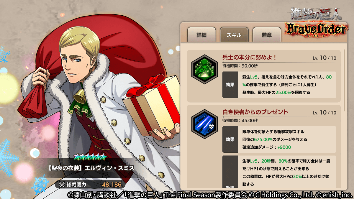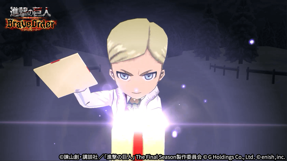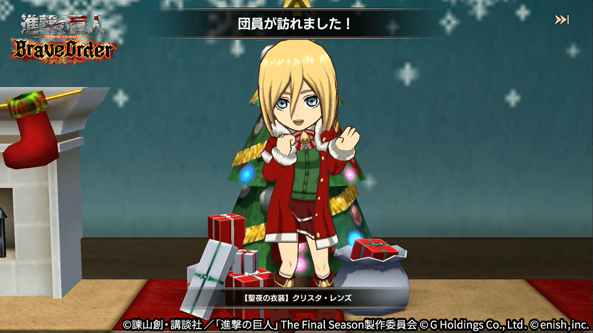 株式会社enish(本社:東京都港区、代表取締役社長:安徳 孝平、以下enish)は、アニメ『進撃の巨人』のスマートフォンゲーム最新作「進撃の巨人Brave Order」にて、12月15日(木)より新イベント「聖なる夜にお祝いを」を開催!イベントアイテムを集めて限定の「おもてなしアイテム」を手に入れよう!また、本日より新登場の【聖夜の衣装】エルヴィン・スミス、【聖夜の衣装】クリスタ・レンズ、【聖夜の衣装】ナイル・ドークがピックアップされた「聖なる夜にお祝いをガチャ」も同時開催!その他、最新情報はゲーム公式サイト・ゲーム公式Twitterアカウントにて随時公開して行きますので、ぜひご覧ください。