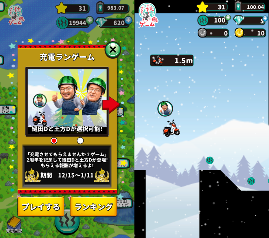 ミニゲームである「充電ランゲーム」では 、昨年に続いて2周年を記念する横断幕が出現中。また、ステージも12月は雪景色のクリスマスバージョン、1月は神社の鳥居などが拝めるお正月バージョンに変化します。ぜひ限定ステージをチェックしてください!