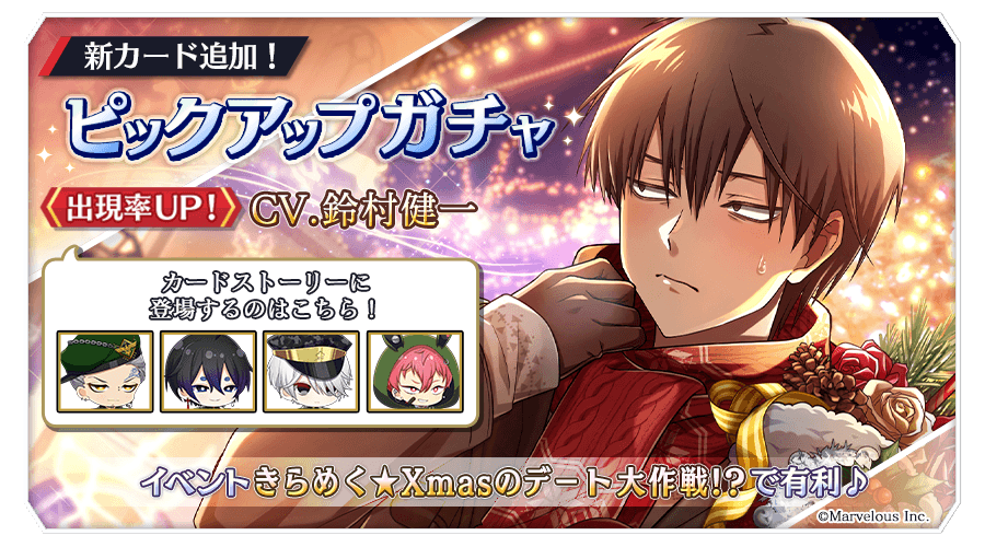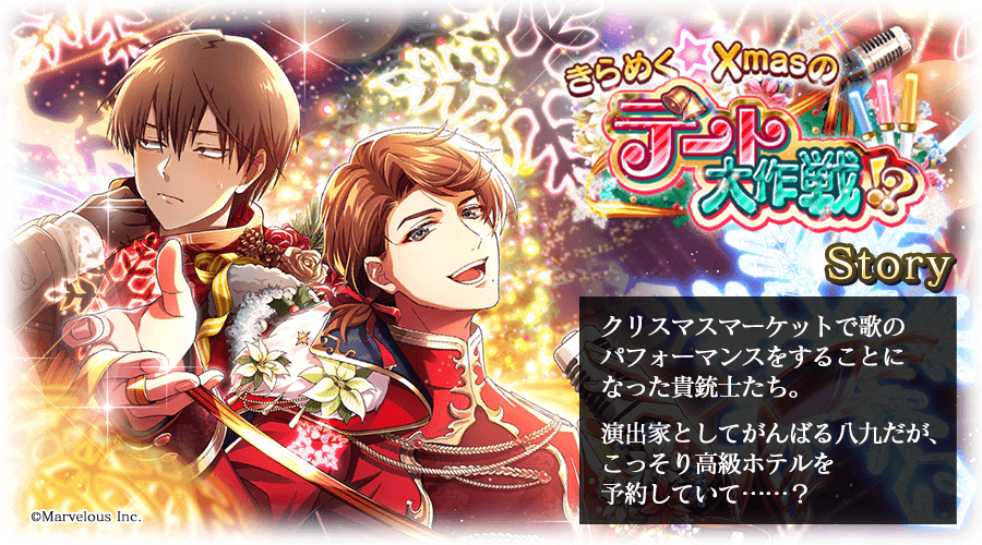 株式会社マーベラス(代表取締役社長:佐藤 澄宣/所在地:東京都品川区)による、スマートフォンゲーム『千銃士:Rhodoknight』(読み:せんじゅうし ろーどないと 以降、『千銃士R』)は、本日よりストーリーイベント「きらめく★Xmasのデート大作戦!?」を開催いたします。本イベントではイベント限定ストーリーが読める他、プロローグ読了で★2「カール(CV:山谷祥生)」のイベント限定カードを獲得できます。イベントにあわせて、イベント内で活躍する★3「八九(CV:鈴村健一)」の新カードがピックアップで登場する期間限定ガチャを開催いたします。