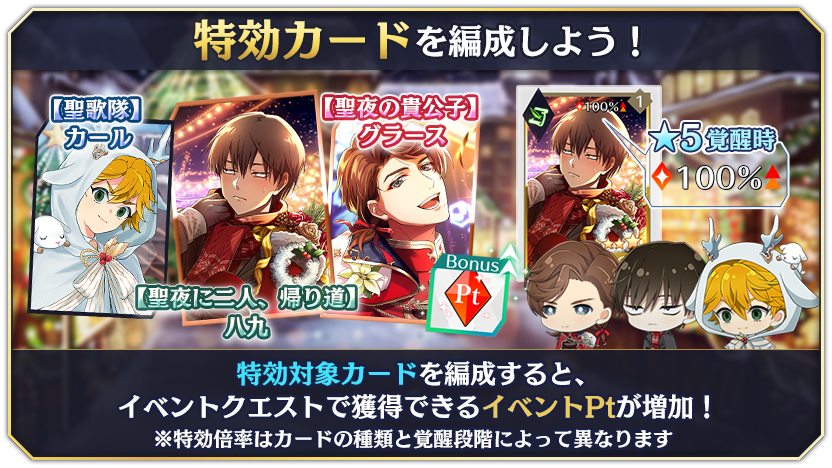 ★3以上のカードには、固有の『カードストーリー』が付き、★4に覚醒することでイラストがLive2Dに変化します!また、★3「聖夜に二人、帰り道】八九」をメインカードに編成すると、現在開催中のイベントで特攻効果が発動します!是非お迎えしてイベントを有利に進めましょう!