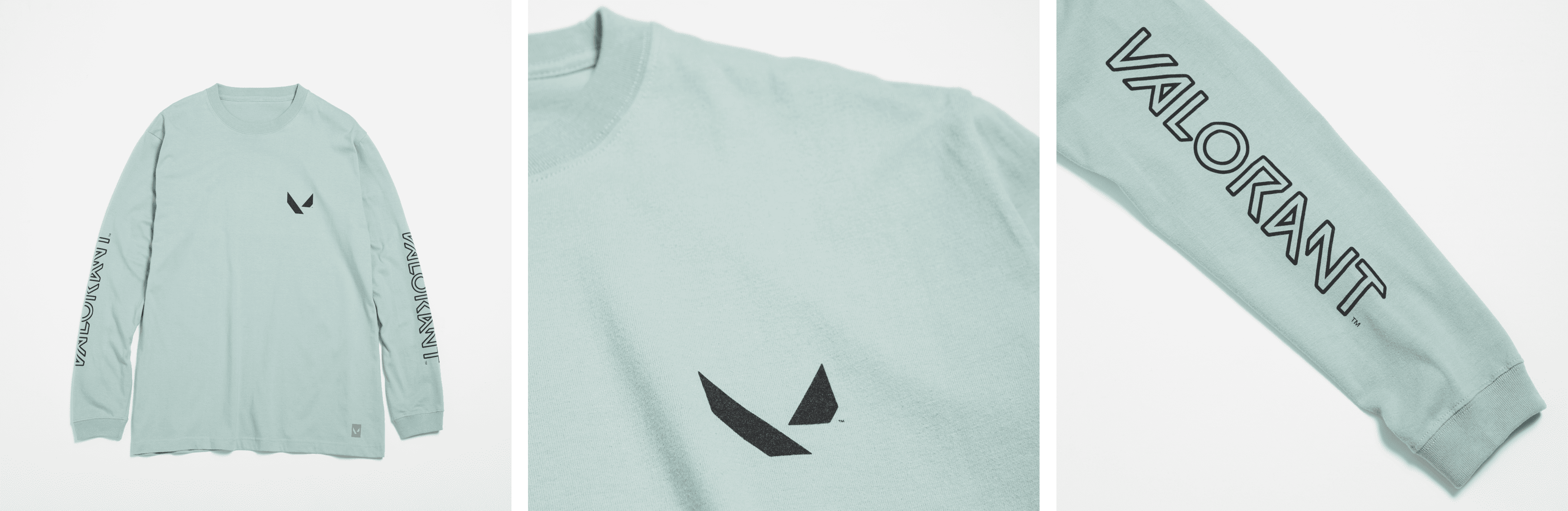 袖に大きくロゴがプリントされたストリートこなしのデザインのロングスリーブ。中抜きのロゴと上品な色使いのボディやプリントが洗練された雰囲気を醸します。裾のVALORANTマークもポイント。毛羽の少ないクリアな素材感で上質さも感じられます。