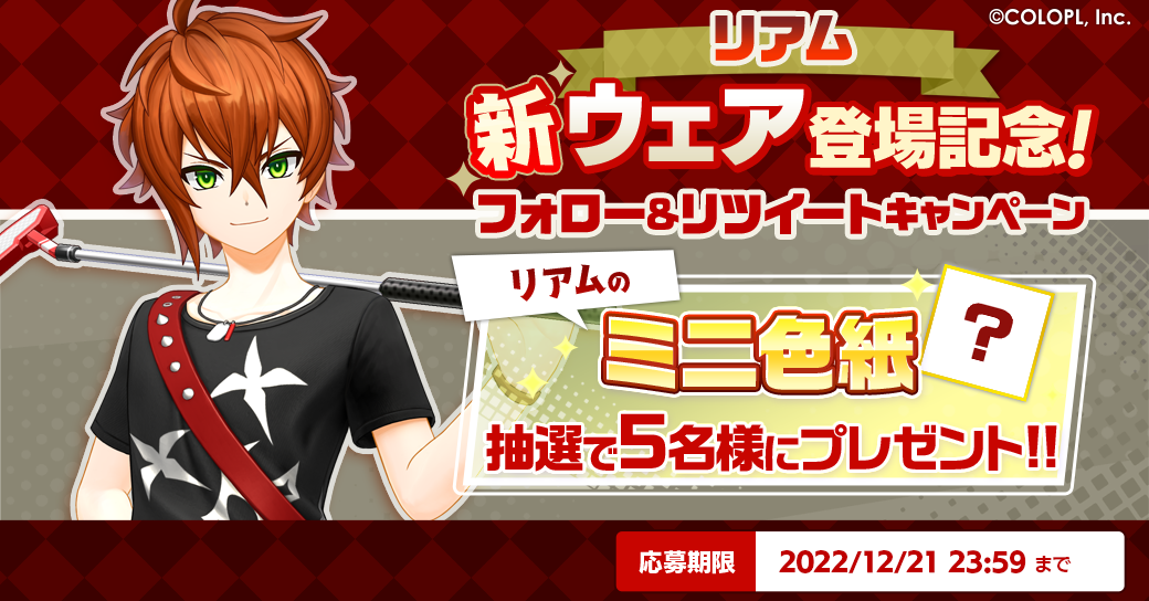 株式会社コロプラ(代表取締役社長:宮本貴志、本社:東京都港区、以下「コロプラ」)は、スマートフォン向け新作ゲーム『白猫GOLF』にて、「リアム(CV:梅原 裕一郎)」の新ウェアが登場したことをお知らせいたします。あわせて、「ミニ色紙」が抽選で5名様に当たるTwitterキャンペーンや、「福引券」などが手に入る「Winterキャンペーン第1弾」も開始しております。