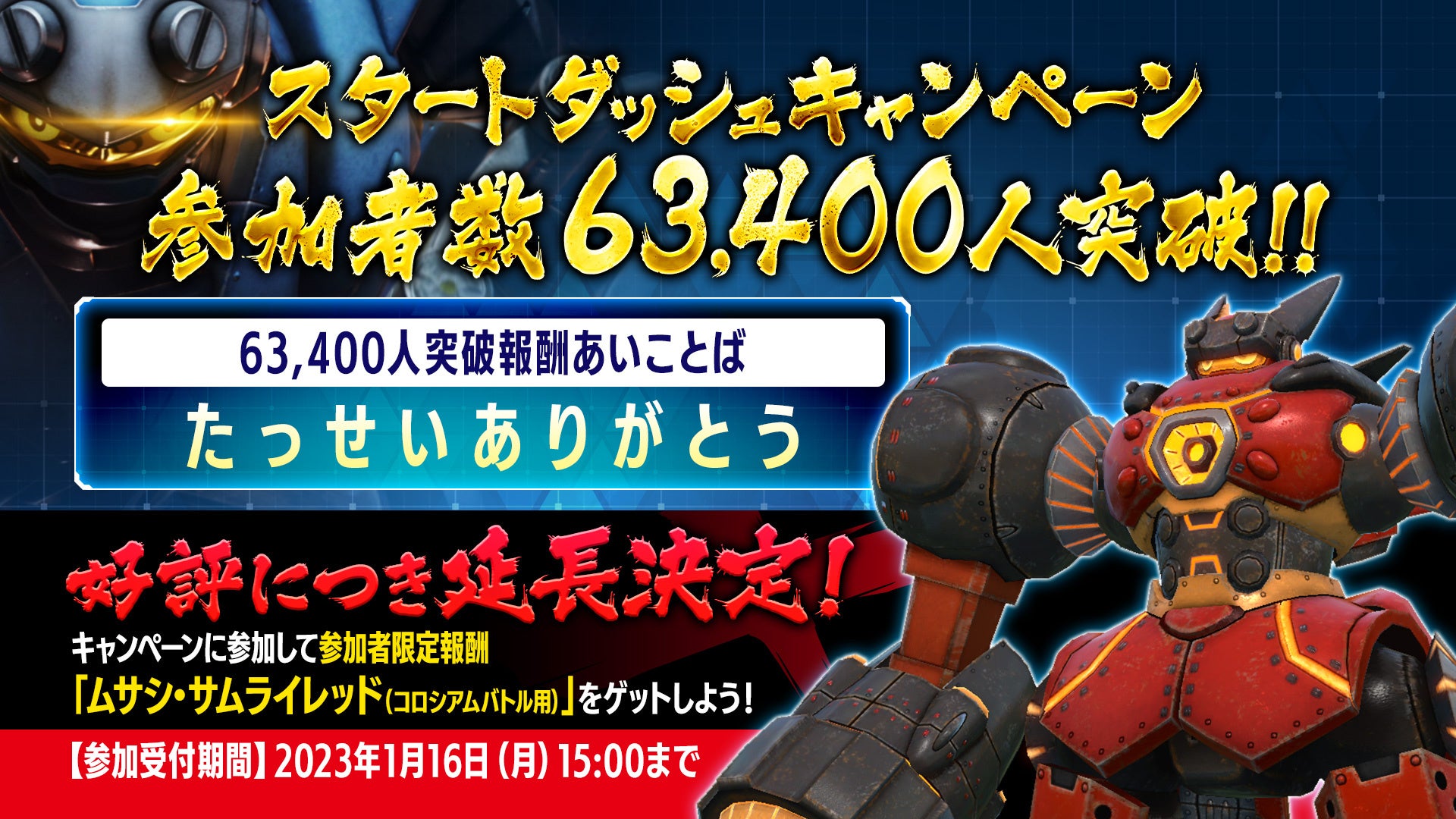 現在開催中の『メガトン級ムサシX(クロス)』スタートダッシュキャンペーンにおいて、参加者数が目標人数63,400人を突破しました!これをうけ、参加受付期間を2022年12月16日(金)15:00までとしていましたが、好評につき2023年1月16日(月)15:00まで延長することを決定!