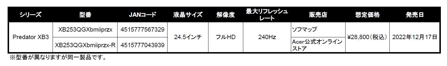 24.5インチのゲーミングモニターPredator XB3 (型番「XB253QGXbmiiprzx」<ソフマップ販売製品>、「XB253QGXbmiiprzx-R」<Acer公式オンラインストア販売製品>。型番が異なりますが同一製品です)は、解像度は鮮明な映像を映し出すフルHDに対応。非光沢のIPSパネルを採用することで、映り込みを抑えています。映像の滑らかさを左右するリフレッシュレートは最大240Hzと高く、0.5ms(GTG, Min.)と速い応答速度を実現。遅延の少ない滑らかな映像でゲームを楽しむことができます。色再現性にも優れ、sRGB 99%をカバーしつつ、広い輝度幅で明るい部分と暗い部分のコントラストをはっきりと表示するVESA DisplayHDR(TM) 400の規格にも対応しています。