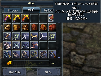 アイテム「オートバトルシステム」はゲーム内の各種族の街にいる雑貨商人などから購入できます。非常に高価なアイテムとなっていますが自動戦闘中もアイテムやクロンを拾うことができるため、NPCの買取金額が高い装備品類がドロップする場所で使用しましょう。また、運営チームが開催するイベントでも入手できる予定です。