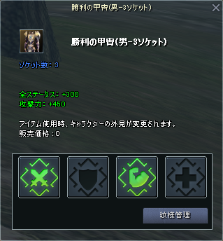 ソケットコスチュームには様々な外見のものが用意されており、好きな見た目のコスチュームに様々な効果が付与できるシステムとなっています。「紋様」は期間制のアイテムとなっていますが、一度ソケットに装着した「紋様」は取り外すことができます。「紋様」はイベントなどで入手することができます。