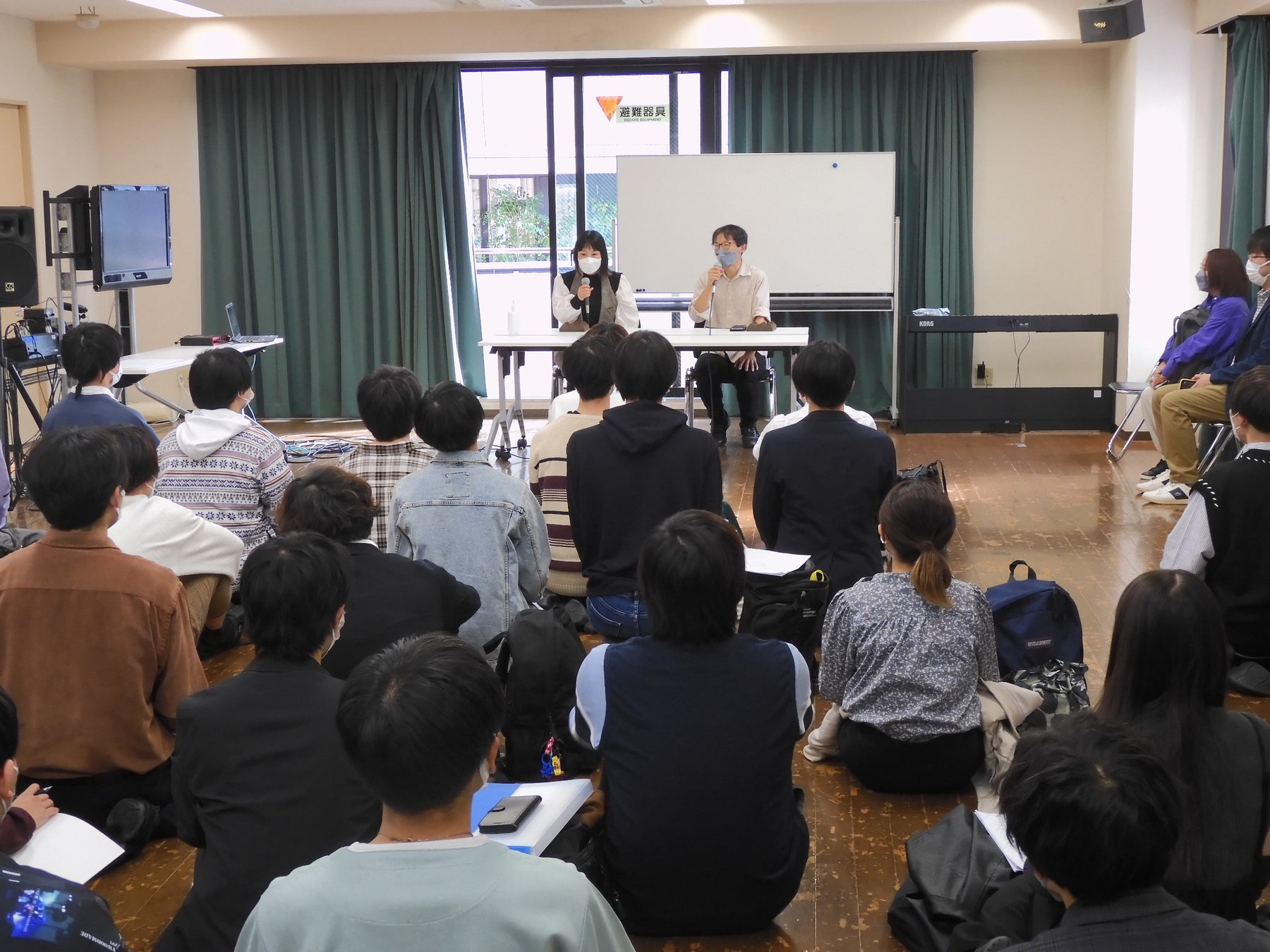 本作で多数のキャラクターボイスを演じている宮負さんと秋山さんには「資料と台本をもらってからスタジオ収録に向かうまでの期間でどのような準備や読解をされているか」や「キャラクターの『演じ分け』」において意識して取り組まれていること」など、演技に関する質問に一つずつ丁寧にお答えいただきました。実際にゲームのキャラクターボイスのお仕事をしている先輩方の言葉は、学生たちにとってどれも貴重なものばかりでした。