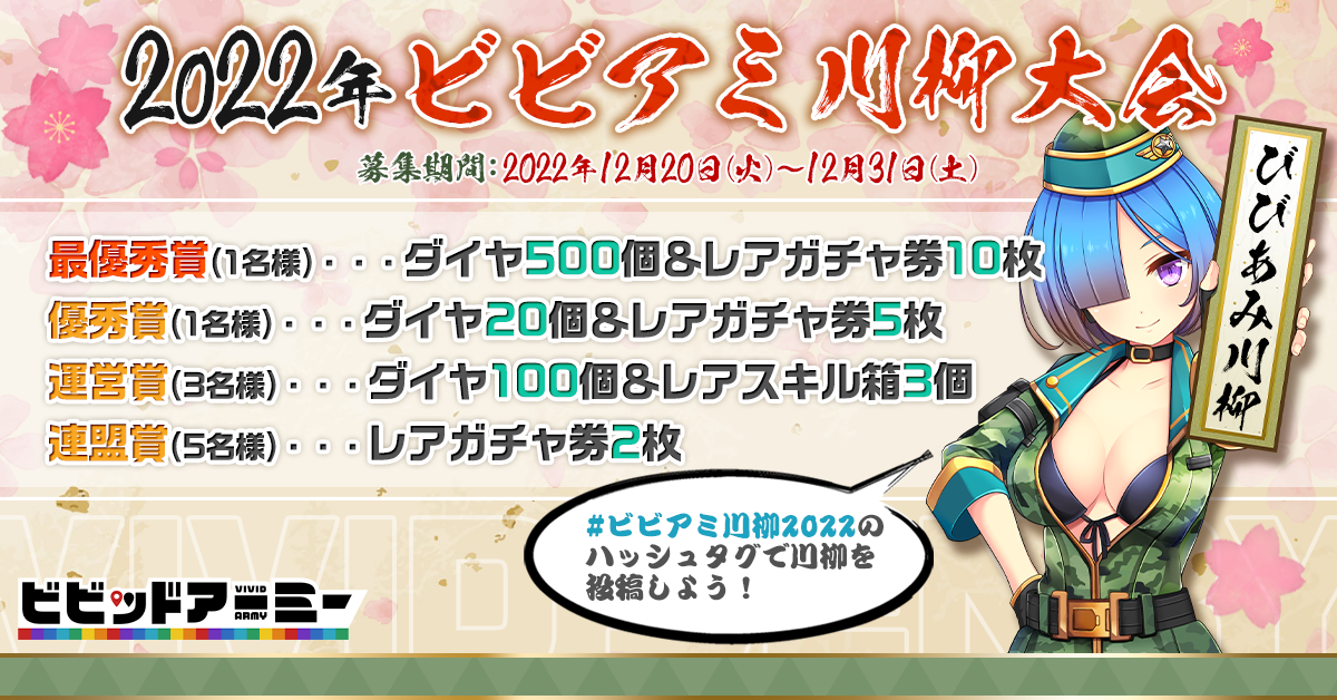 CTW株式会社は、ゲームサービス「G123」にて配信中のHTML5ゲーム『ビビッドアーミー』では、公式Twitterでアイテムが当たる川柳大会を実施いたします。