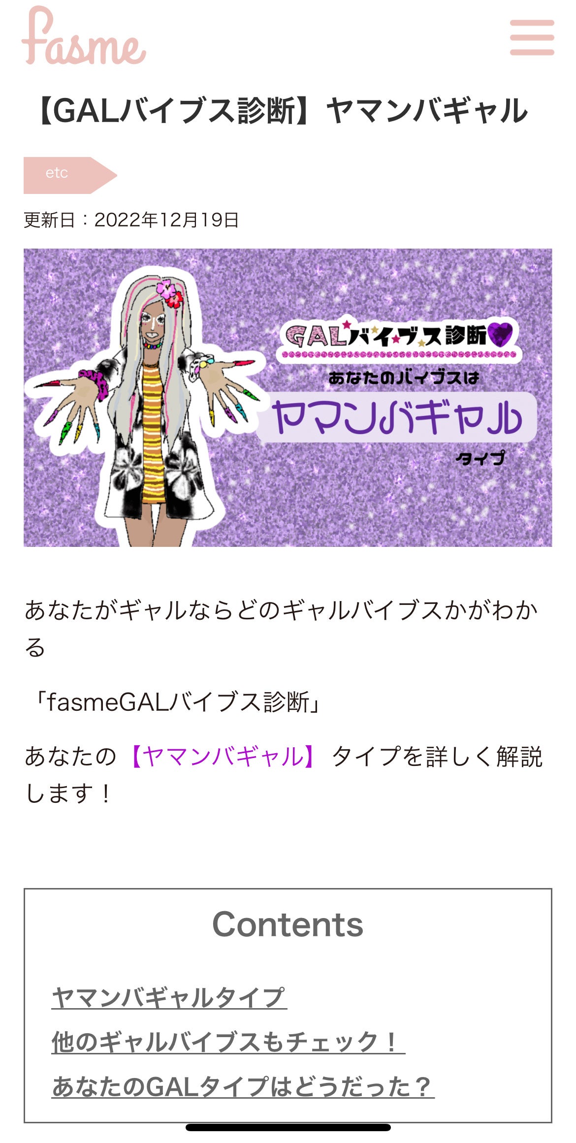 今回の診断は、自分の”バイブス”が「どのギャルタイプ」かがわかる『fasmeGALバイブス診断』。