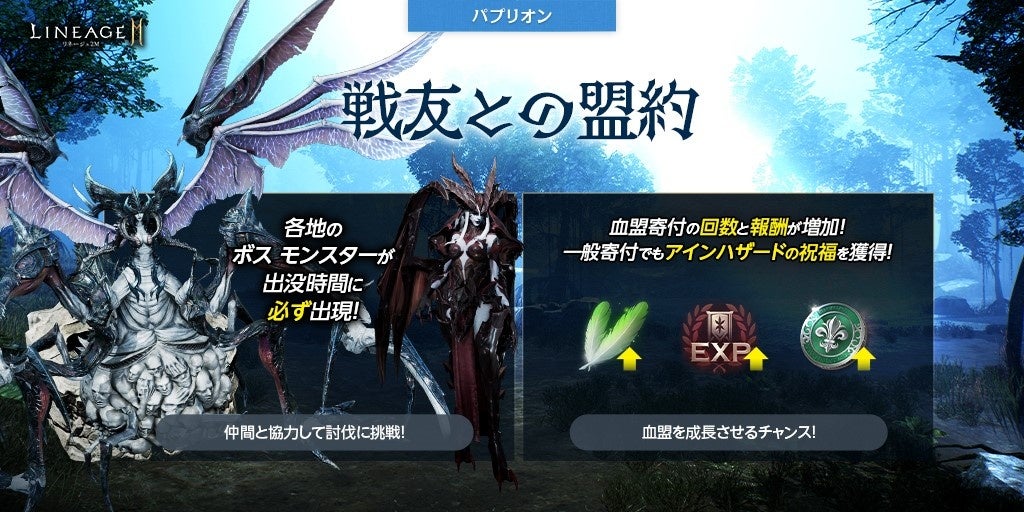 また、血盟での寄付回数が3回から5回に上昇し、寄付時の報酬が2倍になるほか、一般寄付の際に「アインハザードの祝福」300を追加で獲得することができます。