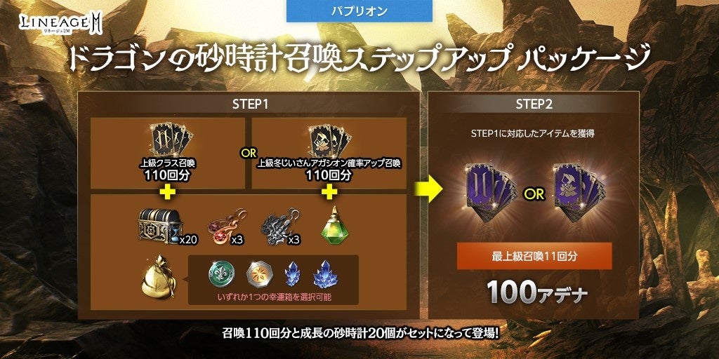 「成長の砂時計箱(刻印)」20個に、クラスの召喚または冬じいさんアガシオン確率アップ召喚110回分、「ヴァラカス イアリング箱(刻印)」3個、「アンタラス イアリング箱(刻印)」3個などがセットになった「ドラゴンの砂時計召喚ステップアップ パッケージ」が登場しました。