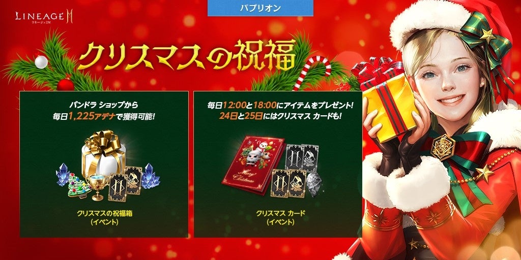 さらに、毎日12時と18時に「アインハザードの祝福」や「クリスタル(刻印)」「クリスマス クッキー(イベント)」などをゲーム内郵便で送付します。さらに、12月24日と12月25日の正午には、「祝福の聖物」や「一般級修練書選択箱(イベント)」、「クリスマス カード(イベント)」「クリスマス プレゼント箱(イベント)」をゲーム内郵便にてお送りします。