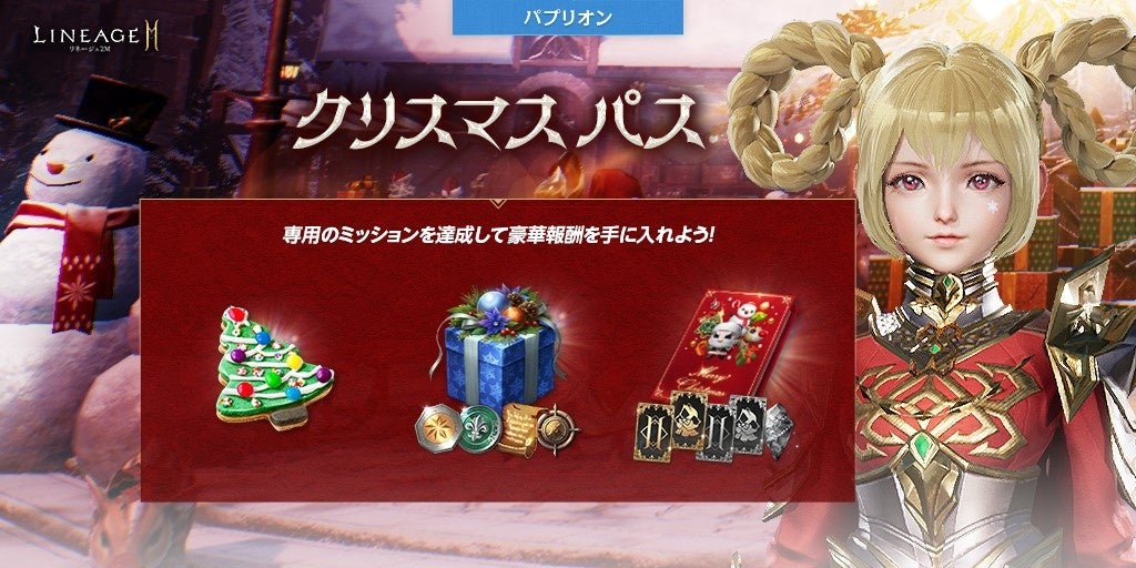期間中、毎日達成していくデイリー ミッションと1週間でクリアを目指すシーズン ミッションで構成された、特別な新規シーズンパス「クリスマス パス」が登場します。デイリー ミッション、シーズン ミッションをそれぞれ達成してシーズンパスEXPを獲得し、パス レベルを上昇させることで様々なアイテムを報酬として獲得することができます。また、1,000アデナを使用することでプレミアム報酬を有効化することができます。最終報酬として、「上級クラス/アガシオン獲得券(6回)(イベント)」などの獲得券を一定確率で手に入れることができるイベントアイテム「クリスマス カード」を獲得することができます。