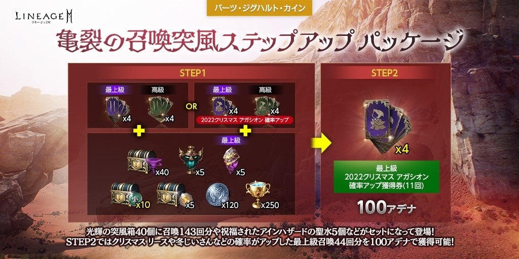 「光輝の突風箱(刻印)」40個に、クラス召喚または2022クリスマス アガシオン確率アップ召喚88回分、「熟練度ボーナス コイン」120個、「祝福されたアインハザードの聖水(刻印)」5個などがセットになった「亀裂の召喚突風ステップアップ パッケージ」が登場しました。