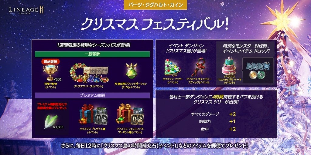さらに、アデン大陸の各村に銅像「クリスマス ツリー(イベント)」が出現します。「クリスマス ツリー(イベント)」に話しかけることで、4時間維持される、「すべてのダメージ +2」「防御力 +1」「命中 +2」のバフを受けることができます。
