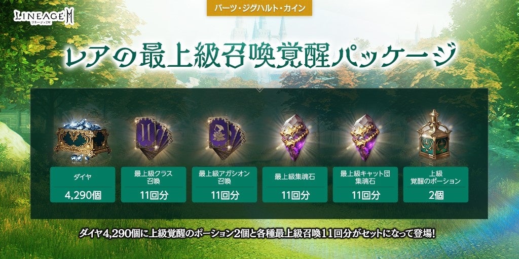 ダイヤ4,290個と「光輝の最上級クラス獲得券II(11回)(刻印)」「光輝の最上級アガシオン獲得券(11回)(刻印)」「光輝の最上級集魂石II(11回)(刻印)」「光輝の最上級キャット団集魂石(11回)(刻印)」がそれぞれ1個ずつ、そして「上級覚醒のポーション(刻印)」2個がセットになった「レアの最上級召喚覚醒パッケージ」が登場しました。