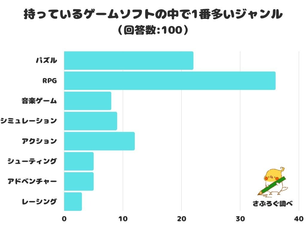 持っているゲームソフトの中で1番多いジャンルをアンケートにて調査したところ、1位は「RPG」でした。