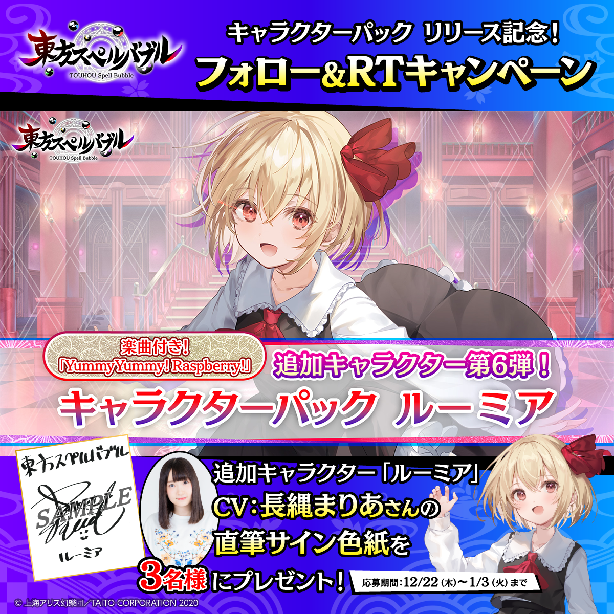 キャラクターパックのリリースを記念して、東方スペルバブル公式Twitter(@touhouSB)をフォロー&リツイートで「ルーミア」のCVを担当された、長縄まりあさんの直筆サイン色紙を抽選で3名様にプレゼント!ぜひ奮ってご参加ください。