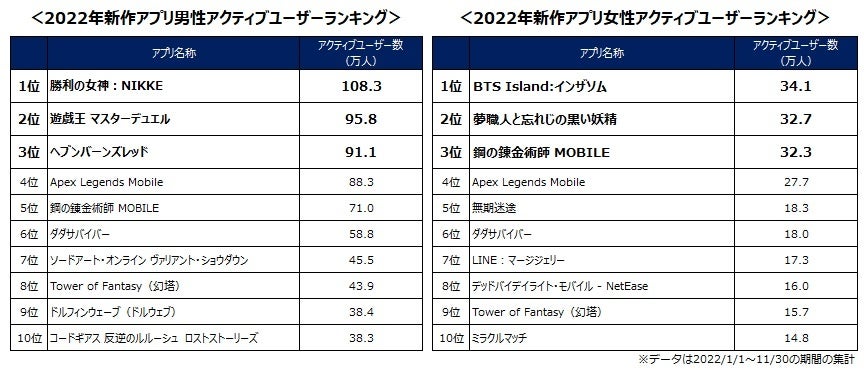 男性で最も多いのは、『勝利の女神:NIKKE』となっており108.3万人。そこに『遊戯王 マスターデュエル』、『ヘブンバーンズレッド』が続きます。女性では『BTS Island:インザソム』の34.1万人が最も多く、それに『夢職人と忘れじの黒い妖精』、『鋼の錬金術師 MOBILE』が続きます。