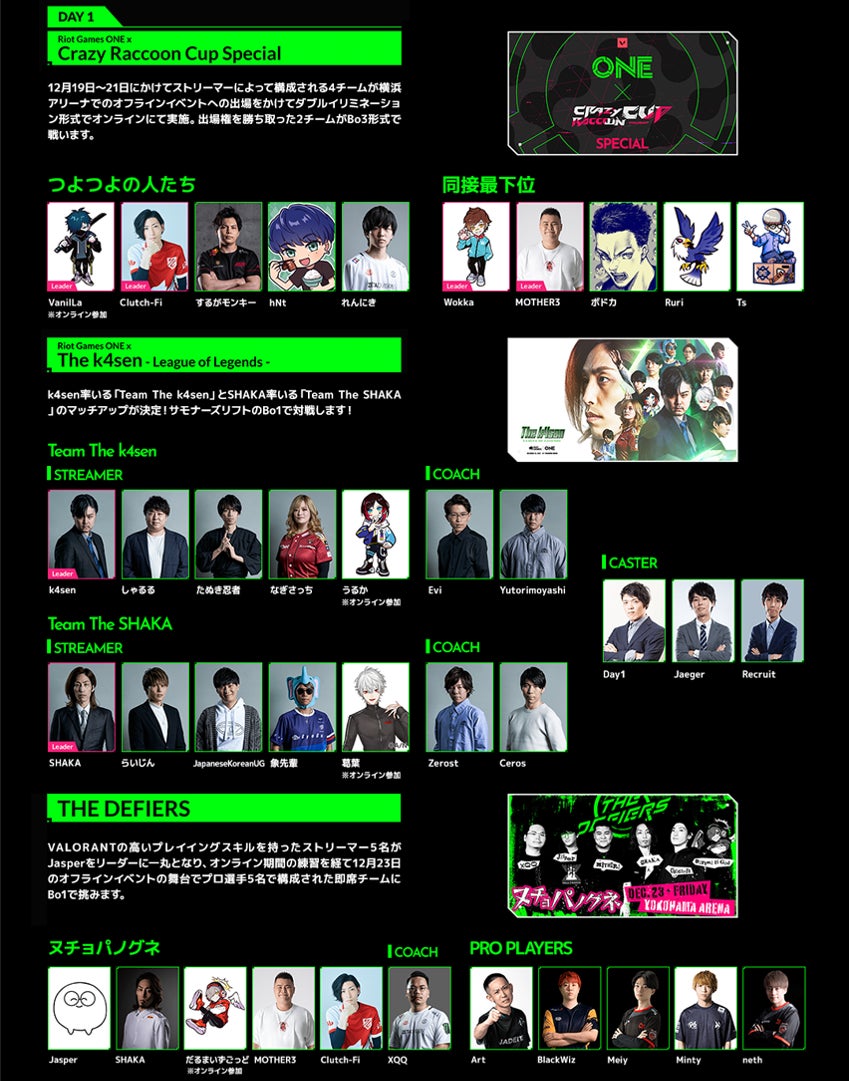 Riot Games, Inc.(米国)の日本法人である合同会社ライアットゲームズ(港区六本木、社長/CEO:藤本 恭史)は、オンライン/オフライン統合イベント『Riot Games ONE(ライアットゲームズ ワン)』において、オフラインイベントへの出場権をかけた戦い「Crazy Raccoon Cup Special」の出場チームにVaniLaさん、Clutch-Fiさん率いる「つよつよの人たち」とWokkaさん、MOTHER3さん率いる「同接最下位」に決定し、12月23-24日に登場する全ての出場者が出揃ったことをお知らせします。
