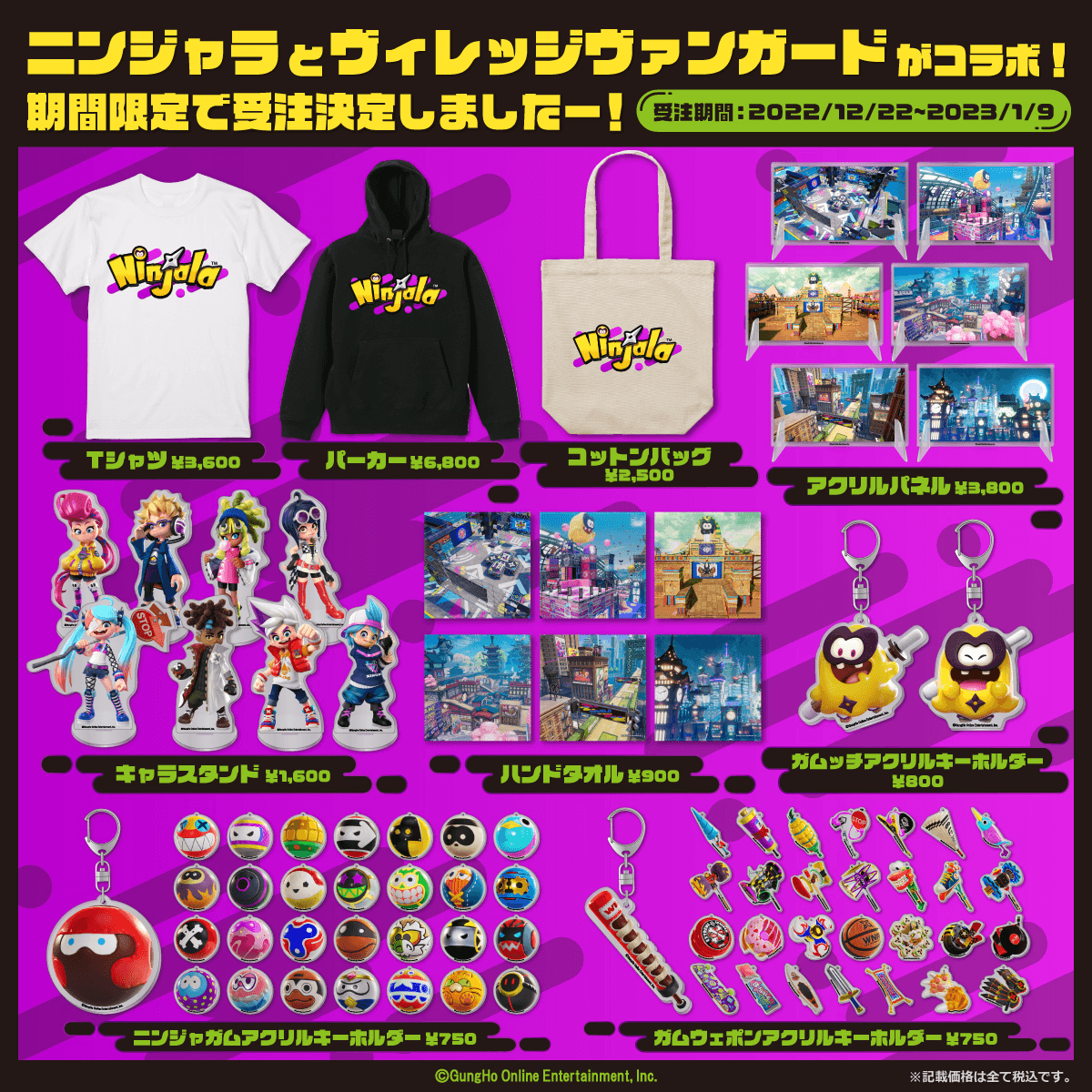 2020年6月25日よりサービスが開始され、瞬く間に大人気になったガンホー・オンライン・エンターテイメントによるNintendo Switch用3D対戦アクションゲーム【ニンジャラ】とヴィレッジヴァンガードとのコラボ第2弾決定!「また一緒に盛り上げるぞ!」と言う事でラインナップも考えました! ロゴを大胆にプリントしたアパレル、各キャラクターやステージをデザインしたアイテムの他、ガムッチや沢山のガムウェポンとニンジャガムのグッズも登場!! ファンなら必ず手に入れたいアイテムとなっております! 2022年12月22日(木)~2023年1月9日(月・祝)までの期間限定完全受注販売となっているのでお買い逃がしにはご注意ください! 今だけ限定のコラボグッズをお見逃しなく!