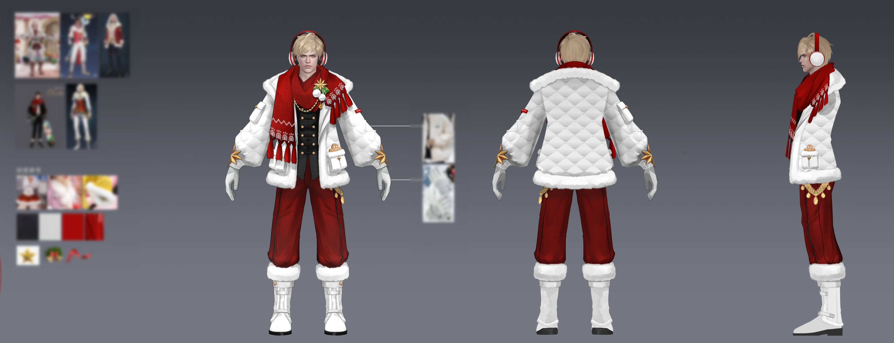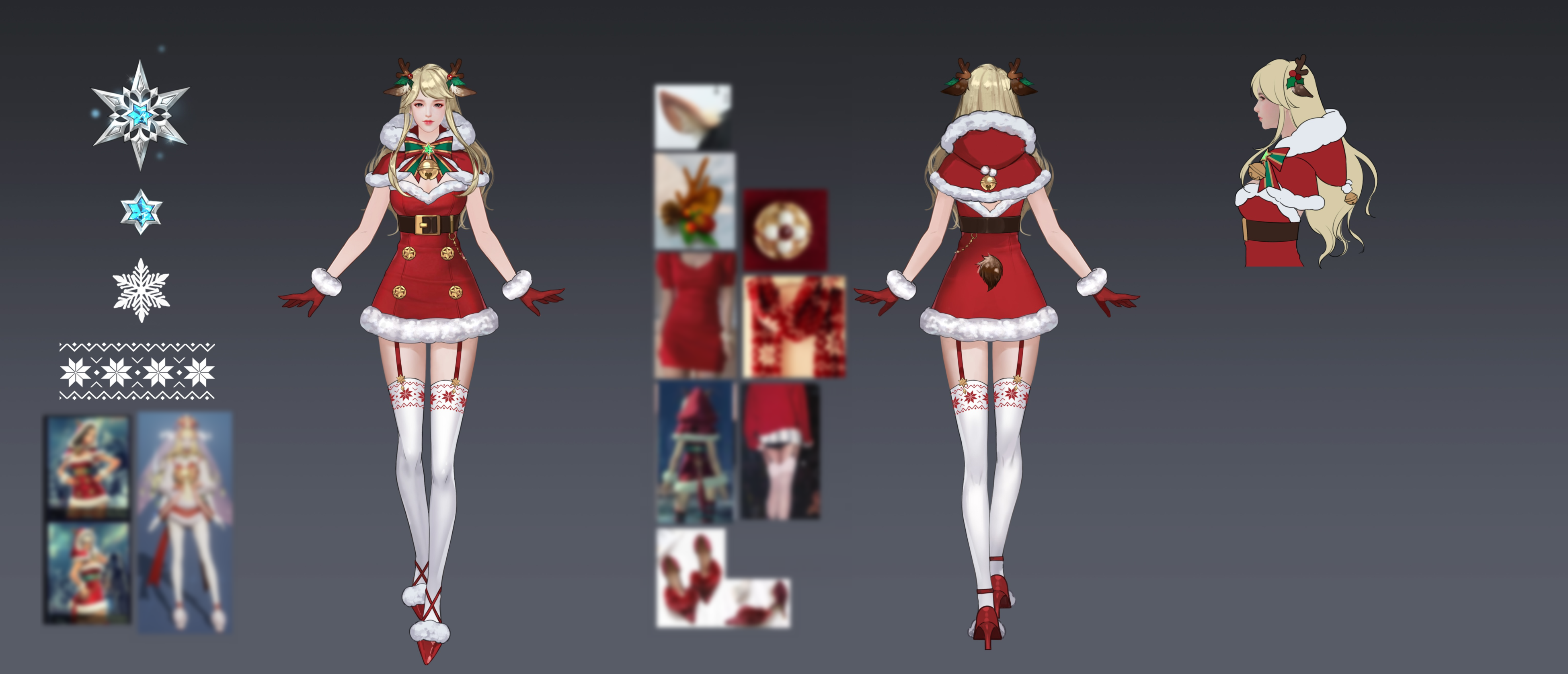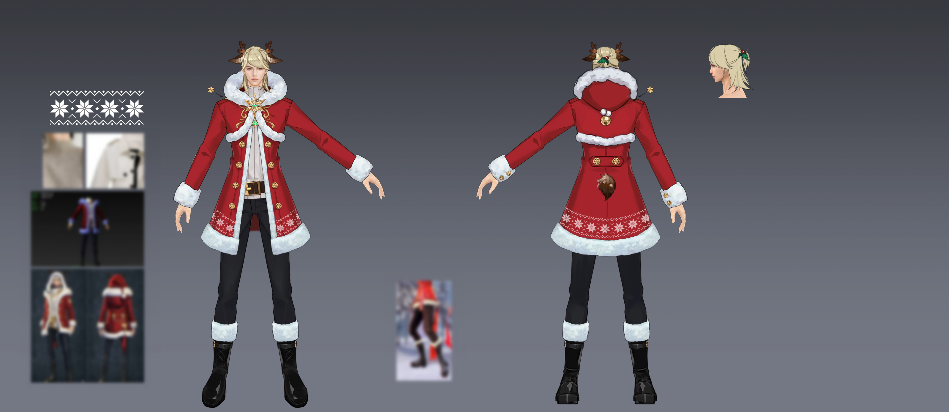 クリスマスのサンタ服仕様のスキン。男性はベーシックなサンタ服なのに対して、女性、幼女のスタイルはミニスカサンタなのがポイントです!頭のトナカイの耳飾りも可愛い。