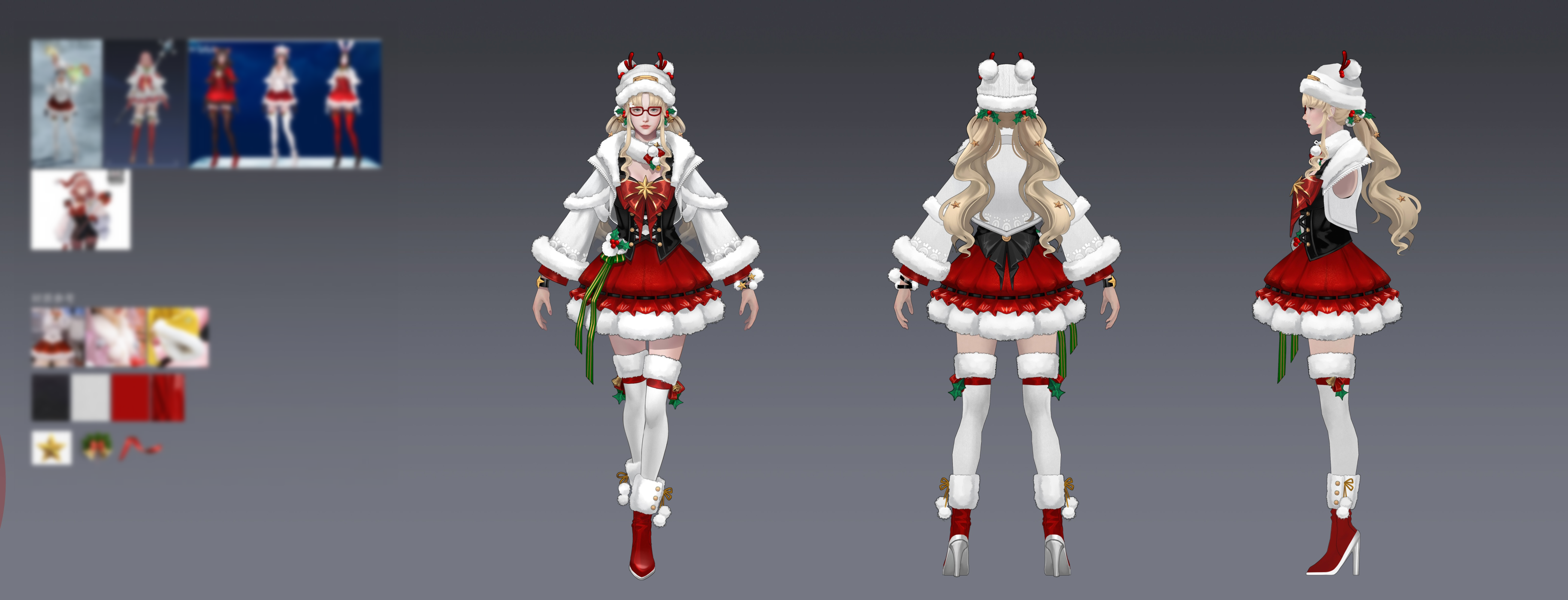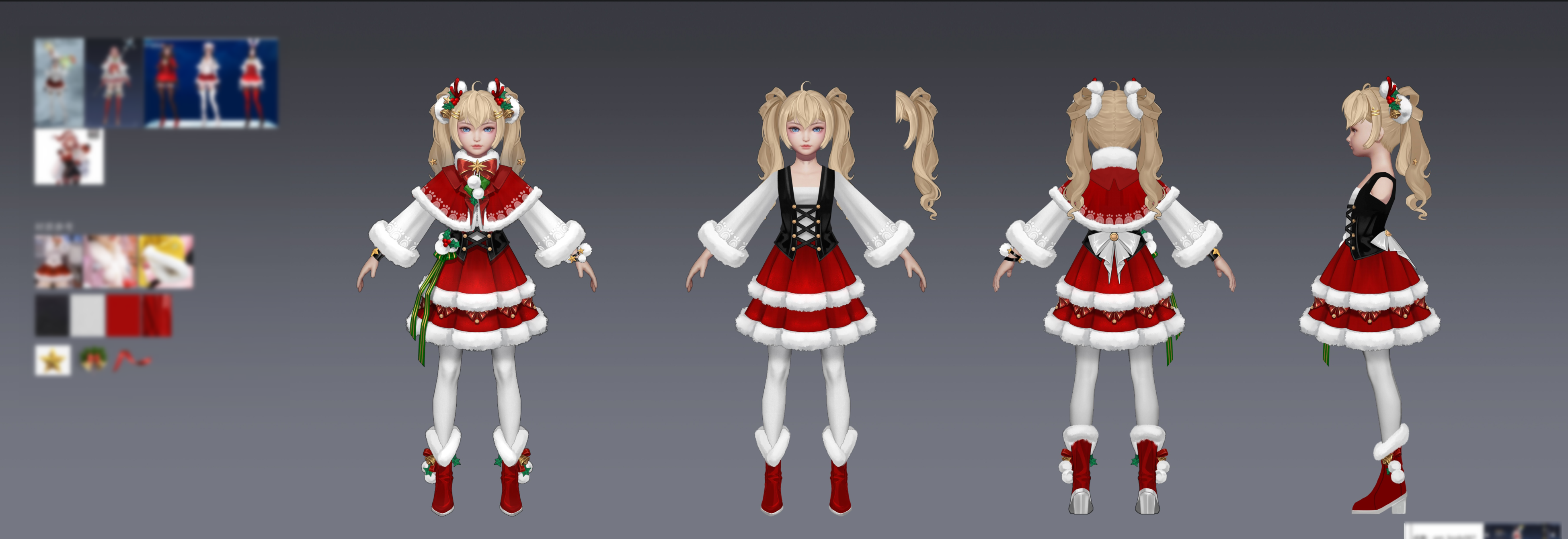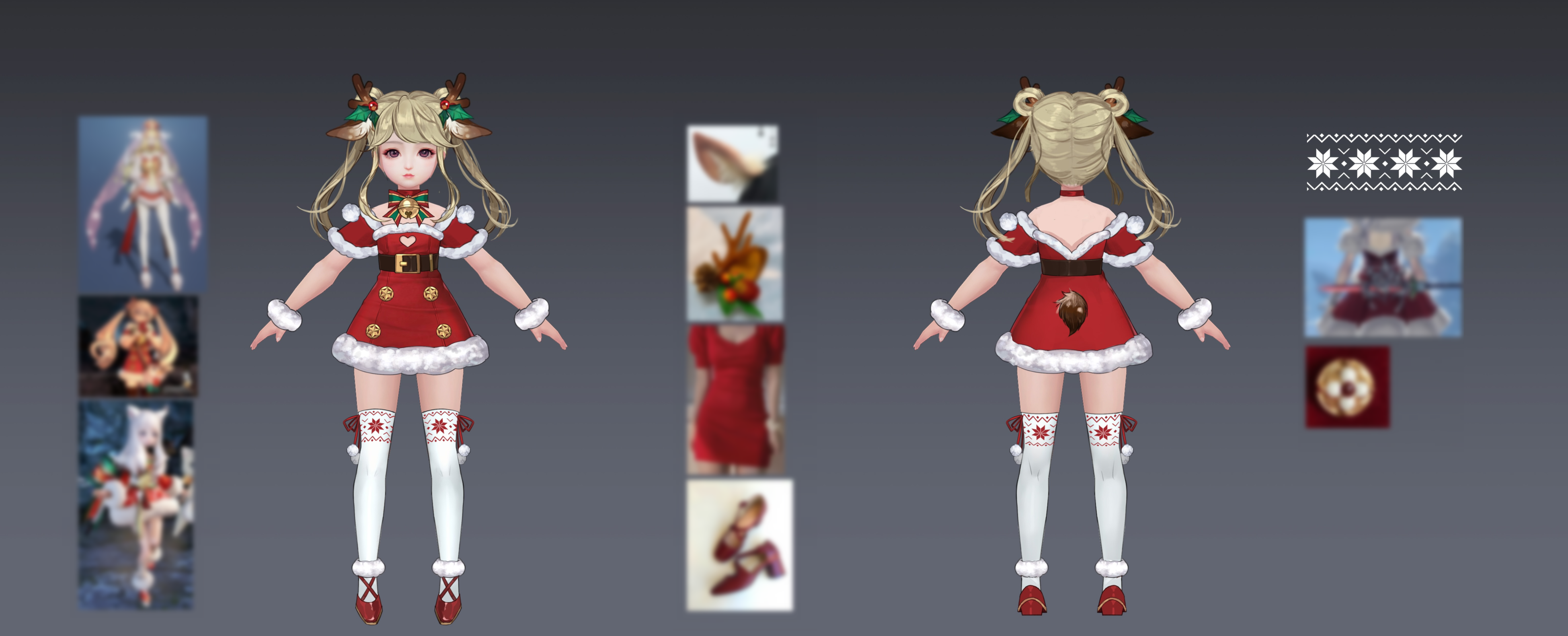 クリスマスのサンタ服仕様のスキン。男性はベーシックなサンタ服なのに対して、女性、幼女のスタイルはミニスカサンタなのがポイントです!頭のトナカイの耳飾りも可愛い。