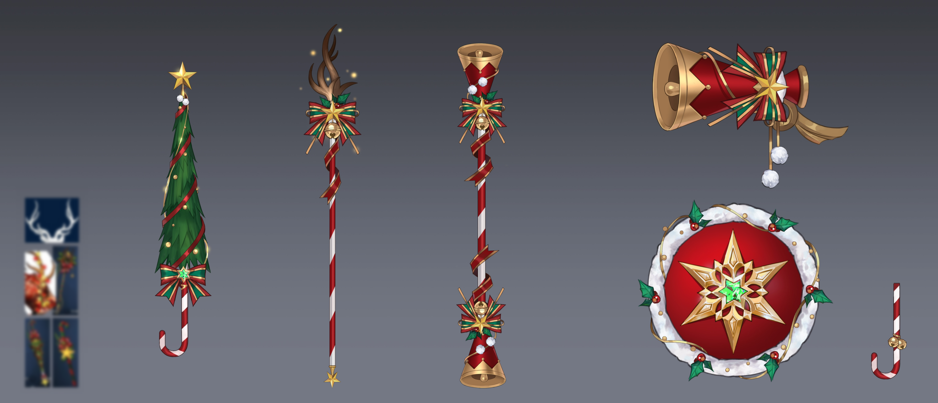 「聖夜の恋人」では、それぞれの職業ごとに異なる武器が楽しめます。クリスマスツリーのような意匠や、ベルのように見えるモチーフなどから季節感を感じられます。