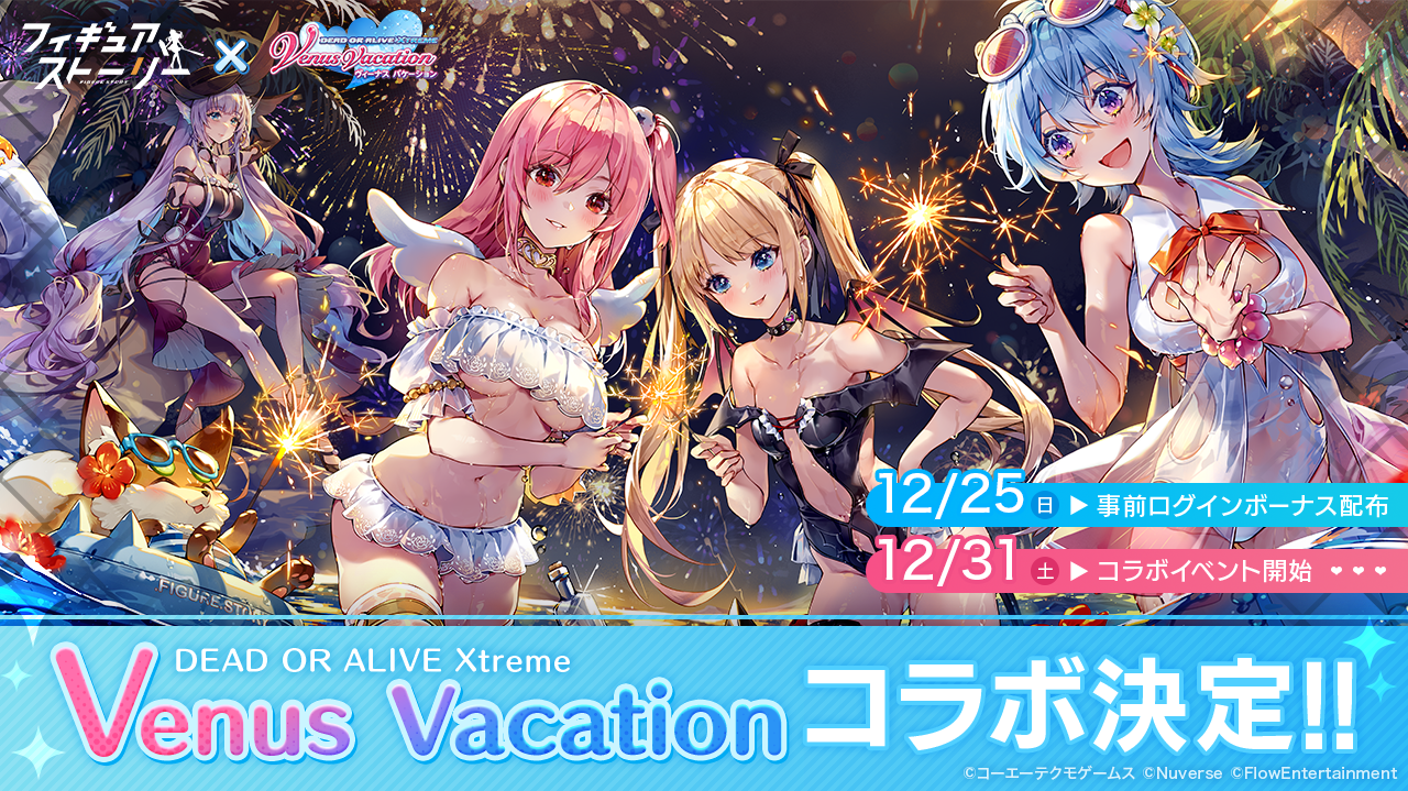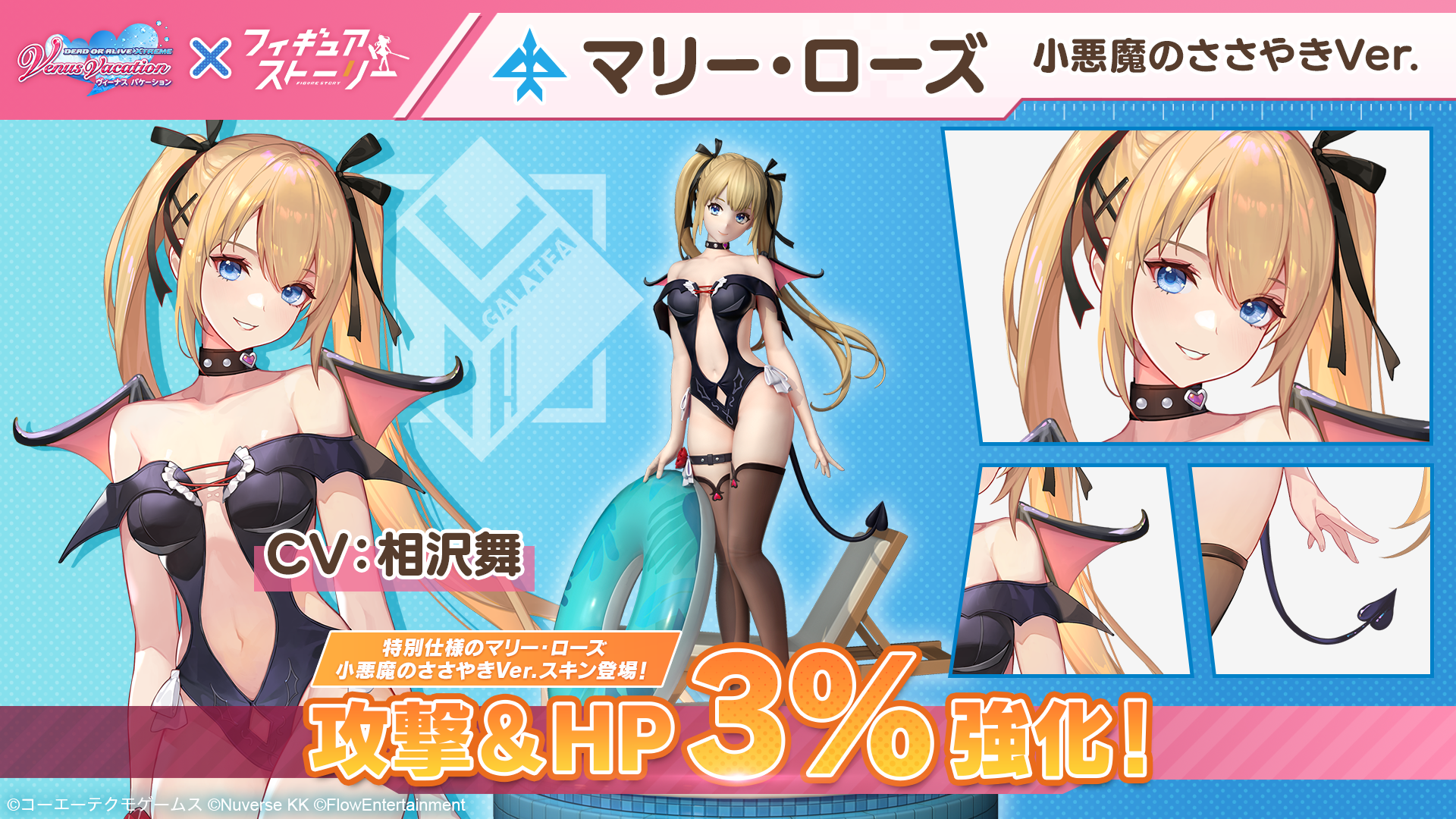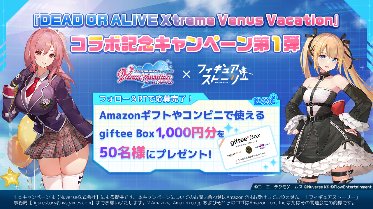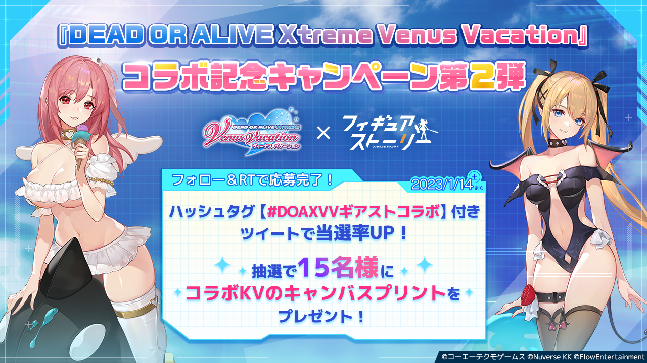 Nuverse株式会社が運営する、フィギュアを題材にしたスマートフォン向けRPG『フィギュアストーリー(以下「ギアスト」)』が、2022年12月25日(日)より、人気ゲーム『DEAD OR ALIVE Xtreme Venus Vacation(以下「DOAXVV」』とのコラボレーションイベントを実施いたします。コラボレーションイベントでは、DOAXVVの人気キャラクター「ほのか(CV:野中藍)」「マリー・ローズ(CV:相沢舞)」のフィギュア及びスキン(着せ替え)がゲーム内に登場するほか、シナリオイベント等を実施いたします。