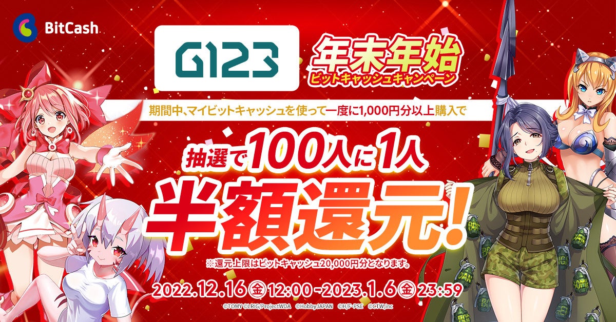 キャンペーン期間中、G123で、マイビットキャッシュを使って1,000円以上ご購入いただくと100人に1人に半額還元いたします。