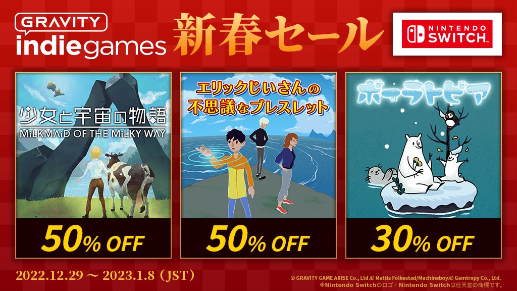 グラビティゲームアライズ株式会社(所在地:東京都中央区)は、世界中から珠玉のインディーゲームを発掘し広めていくプロジェクト「GRAVITY INDIE GAMES」において、SteamとNintendo Switchで配信のゲームが最大50%オフになる年末年始セールを開始いたしました。