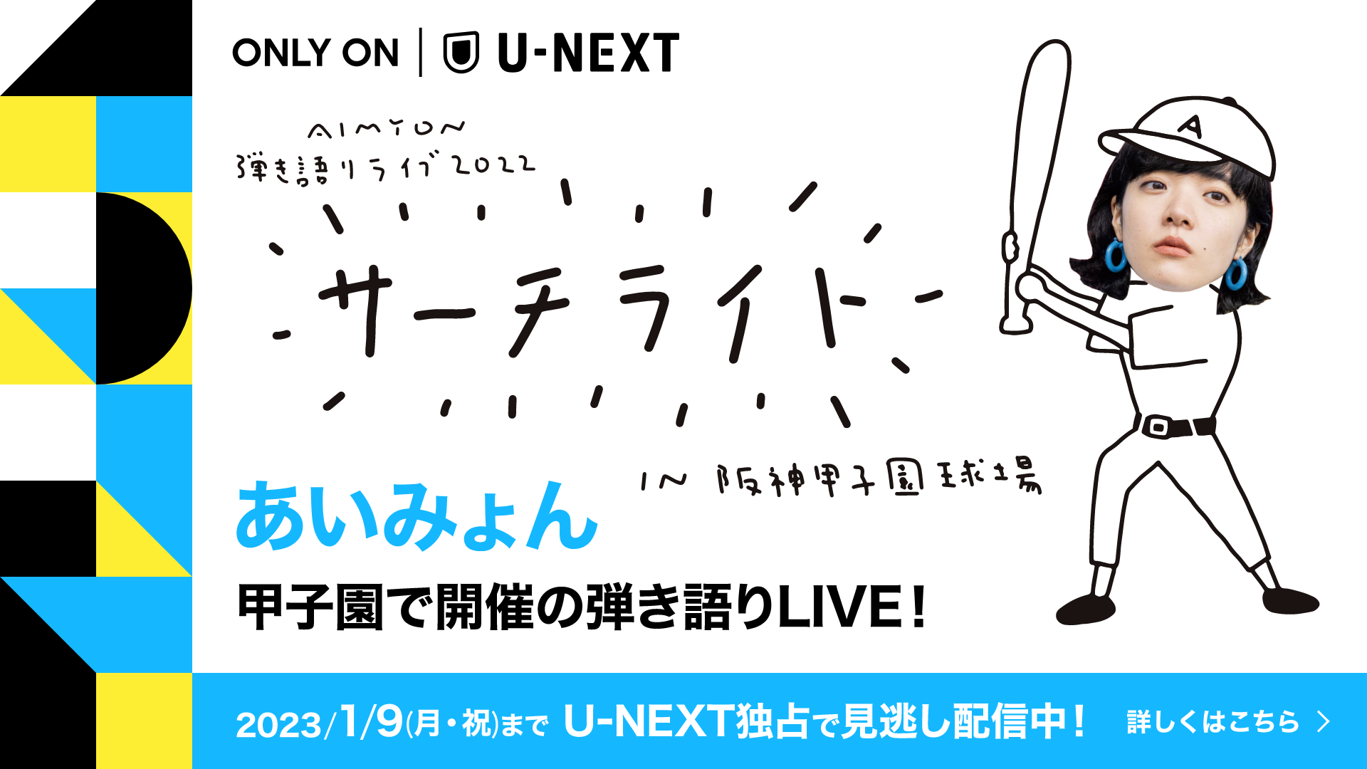 1月9日(月)まで、U-NEXTのみであいみょんの地元・阪神甲子園球場で開催される弾き語りライブ『AIMYON 弾き語り LIVE 2022 -サーチライト- in 阪神甲子園球場』が独占で見逃し配信中となります。ぜひ没入感のあるVR空間でお楽しみください。