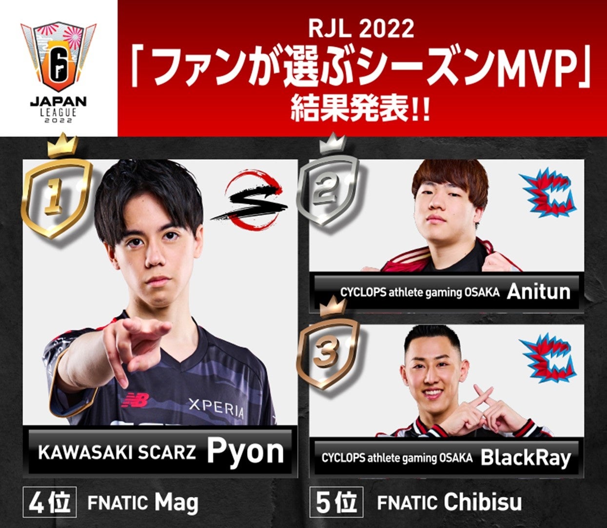 こちらも、RJL 2022で年間ランキング1位となったチームKAWASAKI SCARZよりPyon選手がMVP1位を獲得しました!試合中の的確な判断、試合後インタビューでの冷静な分析がとても印象的な、頭脳派のPyon選手。今シーズンも大活躍となりました!