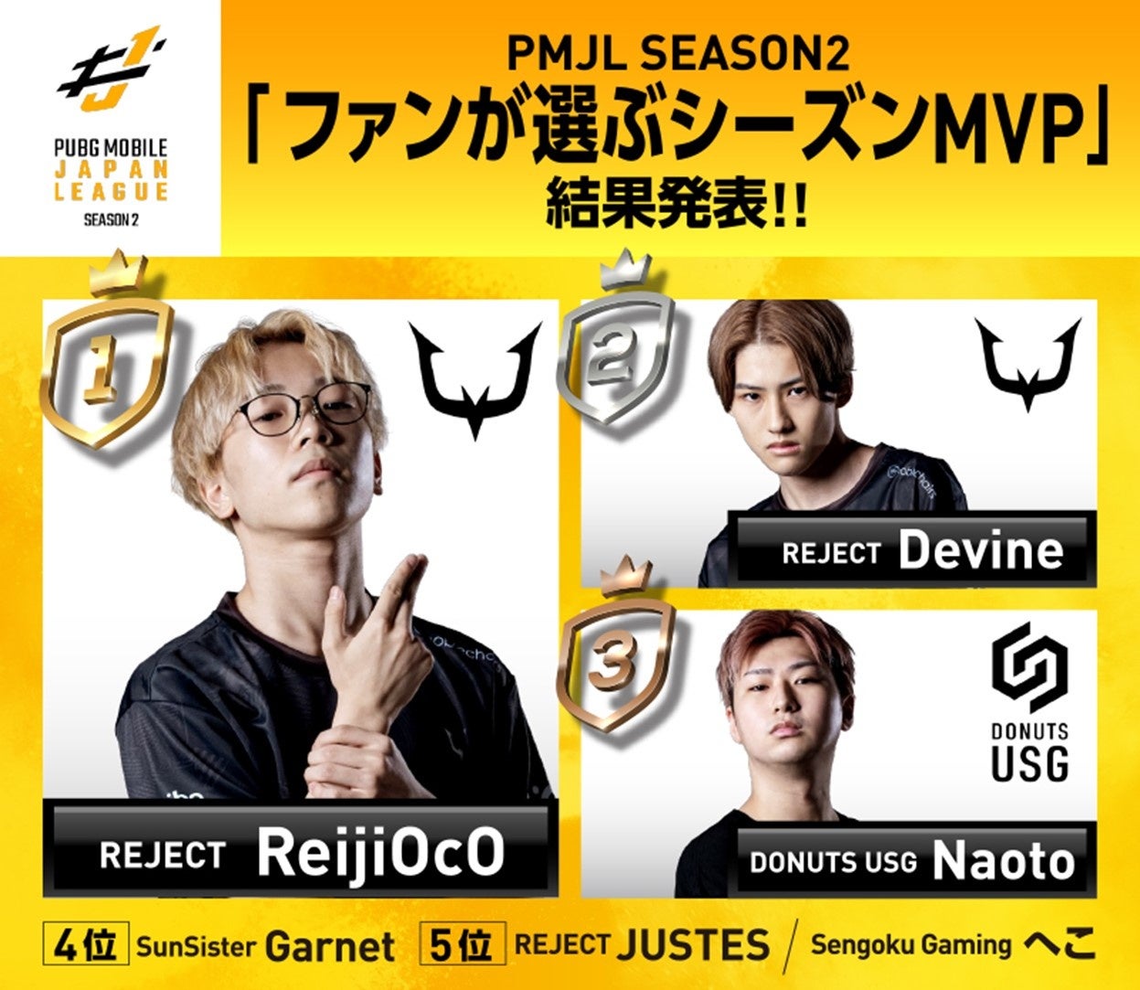 今シーズンのPMJLで16チームの頂点に立ち、年間ランキング1位を獲得したREJECT。ファンの皆さんにとっても印象に残るプレイが多かったのではないかと思います。なかでも、今回のファン投票で1位を獲得したReijiOcO選手は「PMJL SEASON2 Phase2」で最も活躍した選手に贈られる「PHASE MVP」および、最もダメージを与えた選手に贈られる「MOST DAMAGE」も獲得しており、トリプルでの受賞となりました!