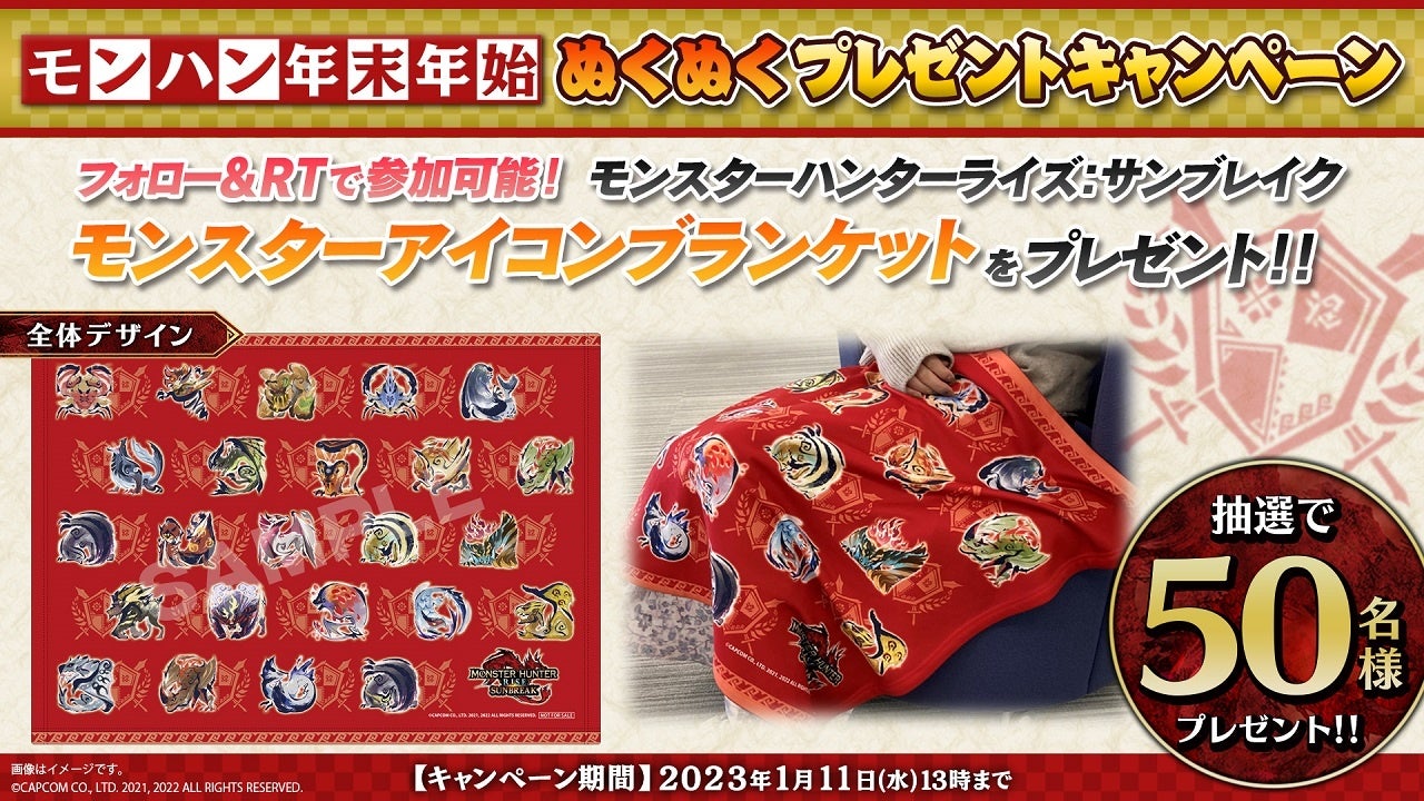 年末年始はモンハンで「一狩りいこうぜ!」ということで、ハンターのみなさまに温かくしながら狩りに勤しんでほしい。そこで、『モンスターハンターライズ:サンブレイク』モンスターアイコンブランケットが50様に当たるキャンペーンを開催いたします。