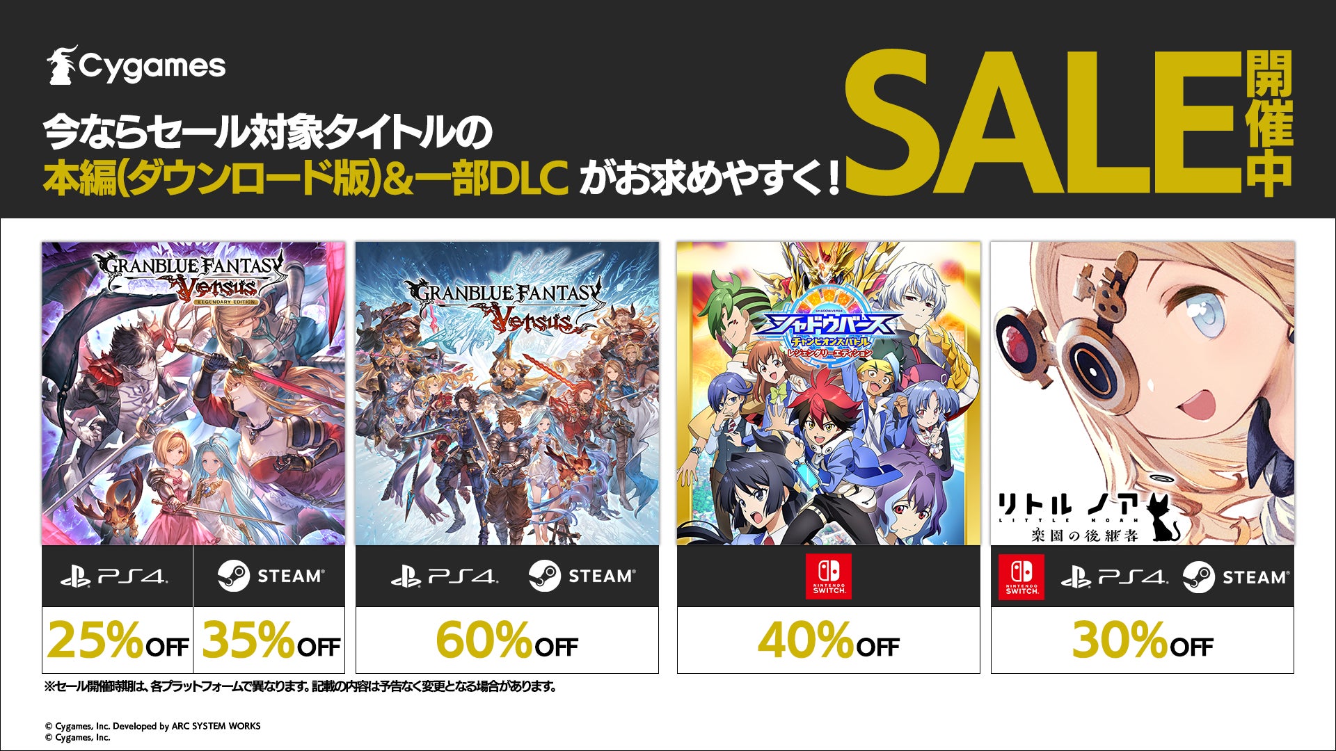 今回のセールでは、サイゲームスのコンシューマーゲームである『グランブルーファンタジー ヴァーサス』、『シャドウバース チャンピオンズバトル』、『リトル ノア 楽園の後継者』のゲーム本編や、一部DLCが対象となります。ぜひこの機会にお楽しみください。
