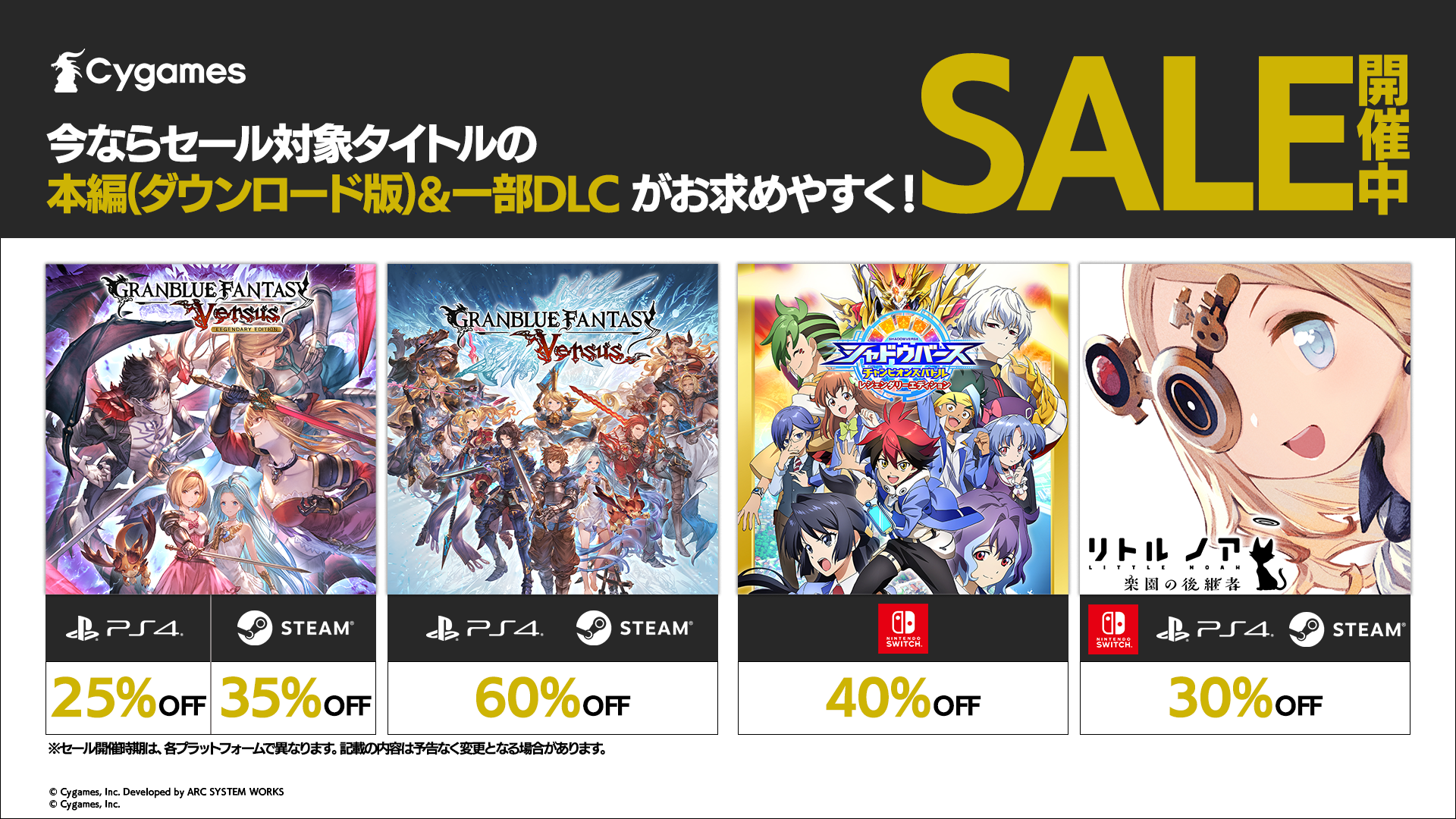 今回のセールでは、サイゲームスのコンシューマーゲームである『グランブルーファンタジー ヴァーサス』、『シャドウバース チャンピオンズバトル』、『リトル ノア 楽園の後継者』のゲーム本編や、一部DLCが対象となります。ぜひこの機会にお楽しみください。