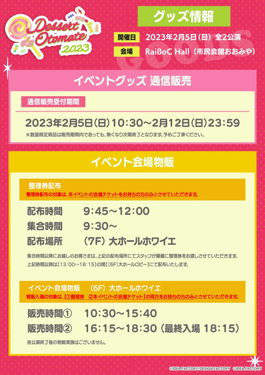 アイディアファクトリー株式会社(代表取締役社長:佐藤 嘉晃/所在地:東京都豊島区)の女性向けゲームブランド「オトメイト」は、2023年2月5日(日)開催予定、オトメイトファンイベント「Dessert de Otomate 2023」のイベント公式HPにイベント物販情報を公開しました。