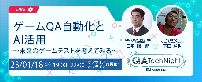 「品質管理に、革命を。」を理念に、ゲームのテスト自動化などの品質管理事業を展開するAIQVE ONE(アイキューブワン)株式会社(本社:東京都千代田区、代表取締役社長:山崎太郎、以下AIQVE ONE)は、2023年1月18日(水)にゲーム開発に携わっている方、品質管理に携わっている方を対象にしたセミナーイベント「QA Tech Night vol.7」をオフライン・オンラインのハイブリッド形式にて開催いたします。